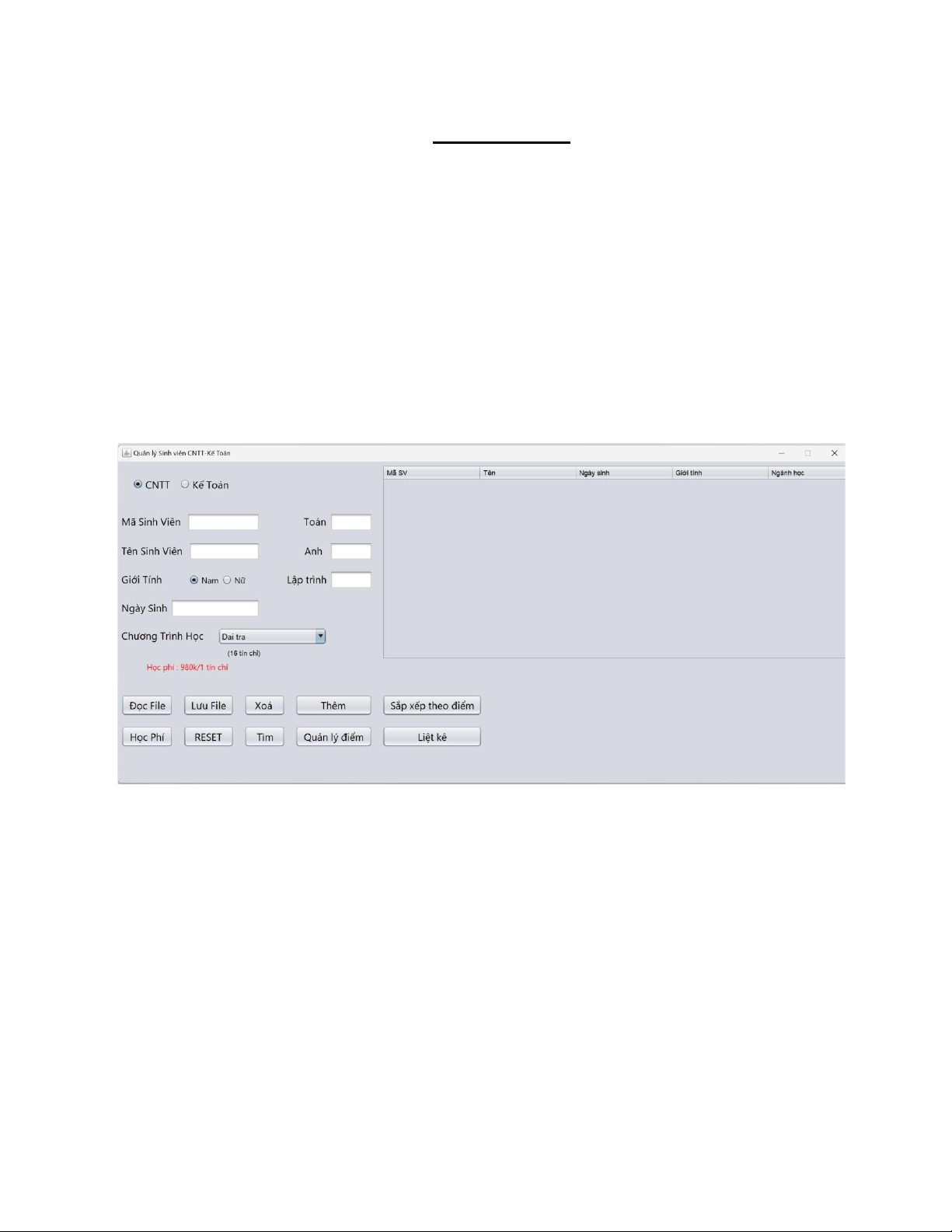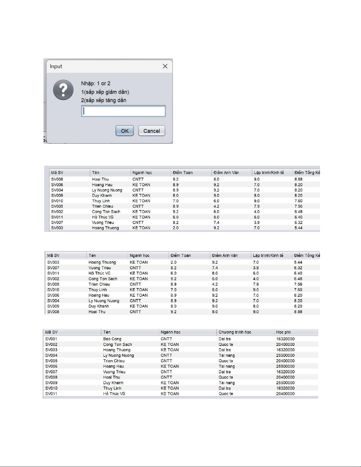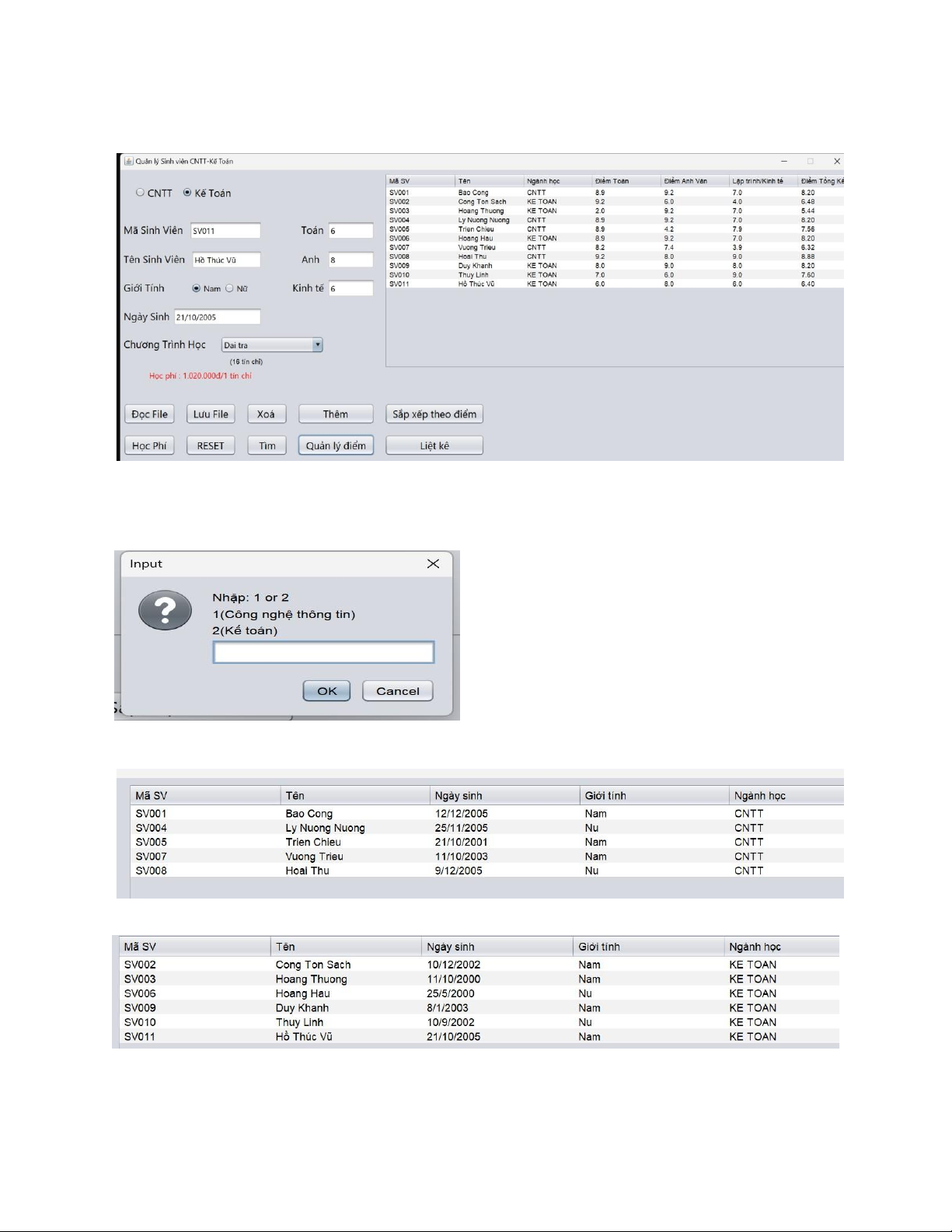 - Quản lý điểm: in thông tin điểm các môn Toán ,Anh ,Lập trình hoặc Kinh tế