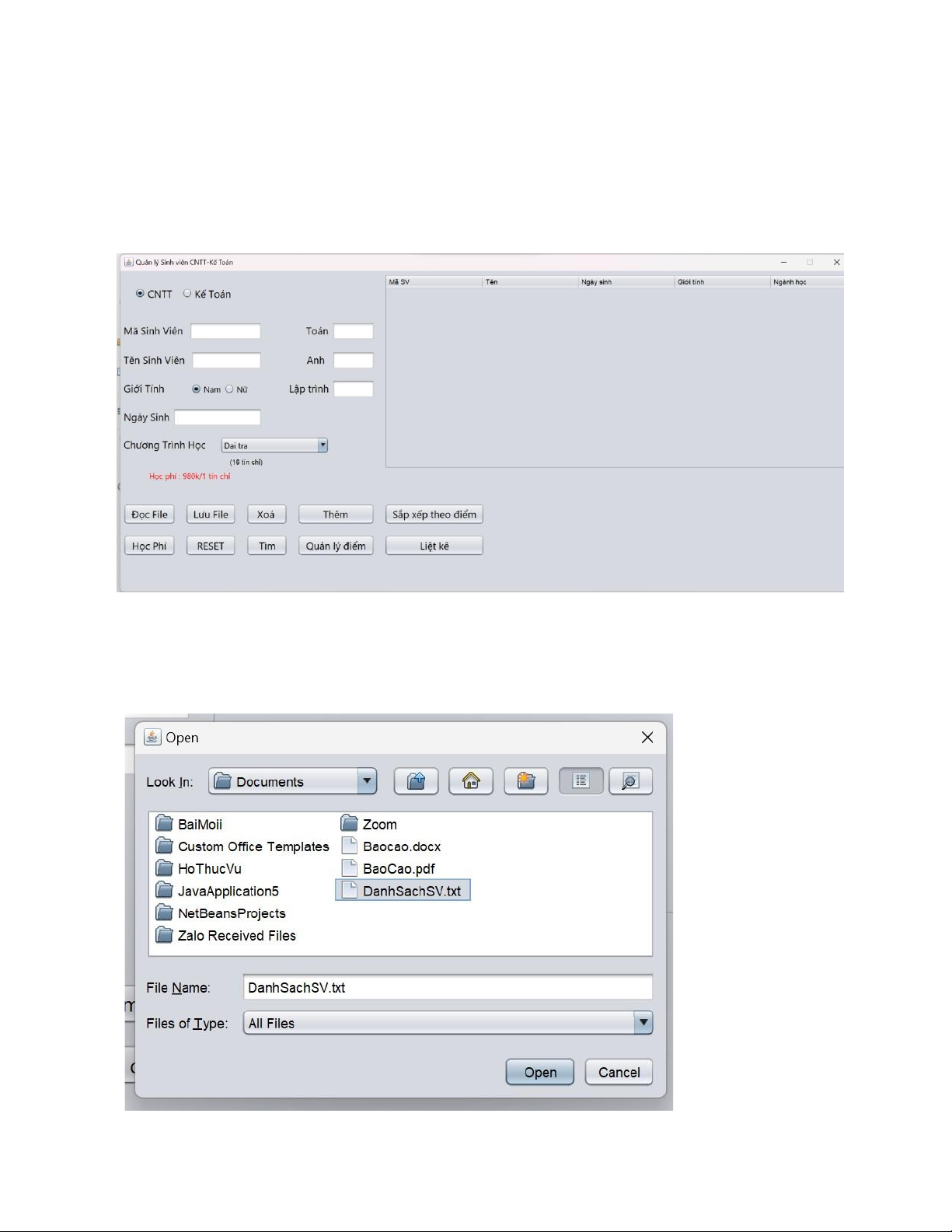 - Đọc File : đọc dữ liệu từ file đã lưu và in nội dụng lên Table.