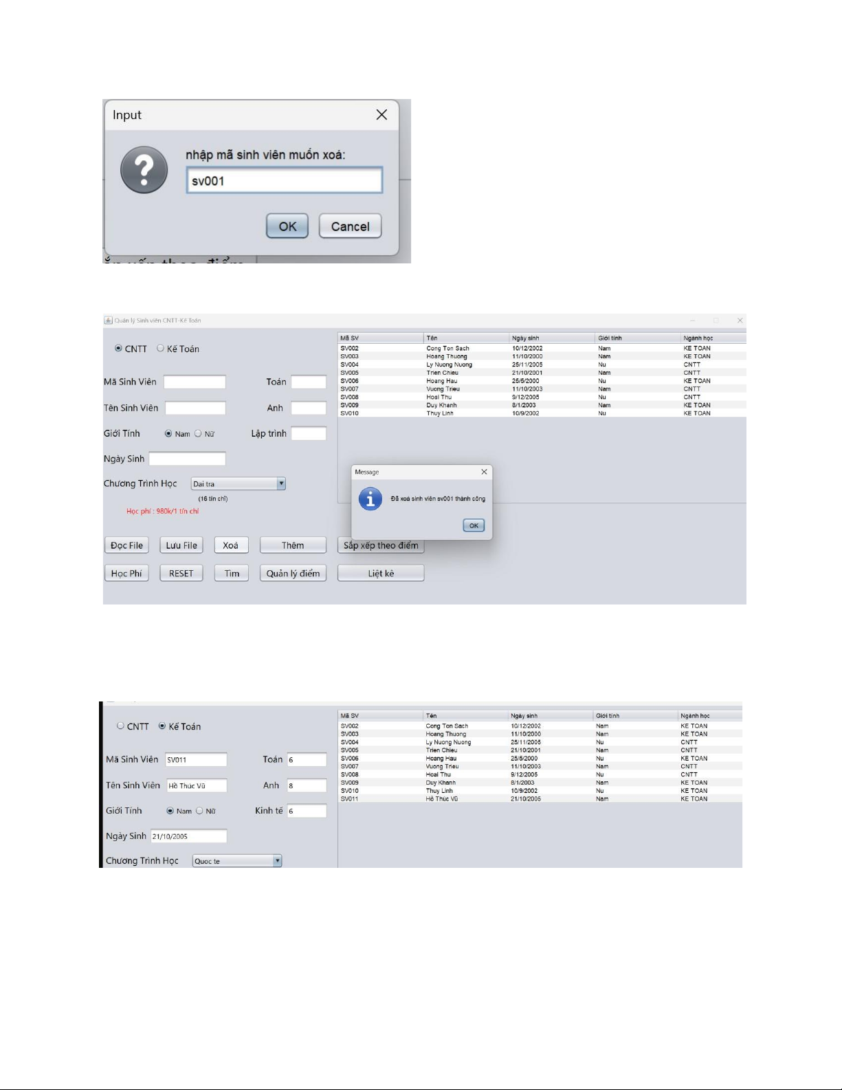 - Xóa: xóa dữ liệu sinh viên theo mã sinh viên do người dung nhập từ bàn phím