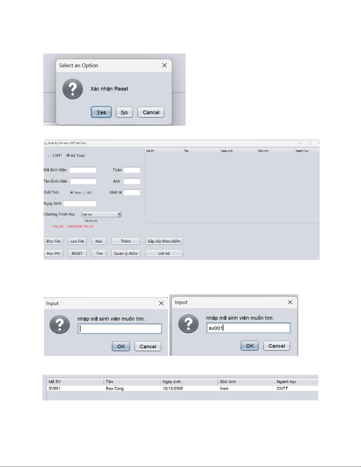- Reset: xóa tất cả dữ liệu mà người dùng đã nhập vào TextField và dữ liệu được in trên Table.