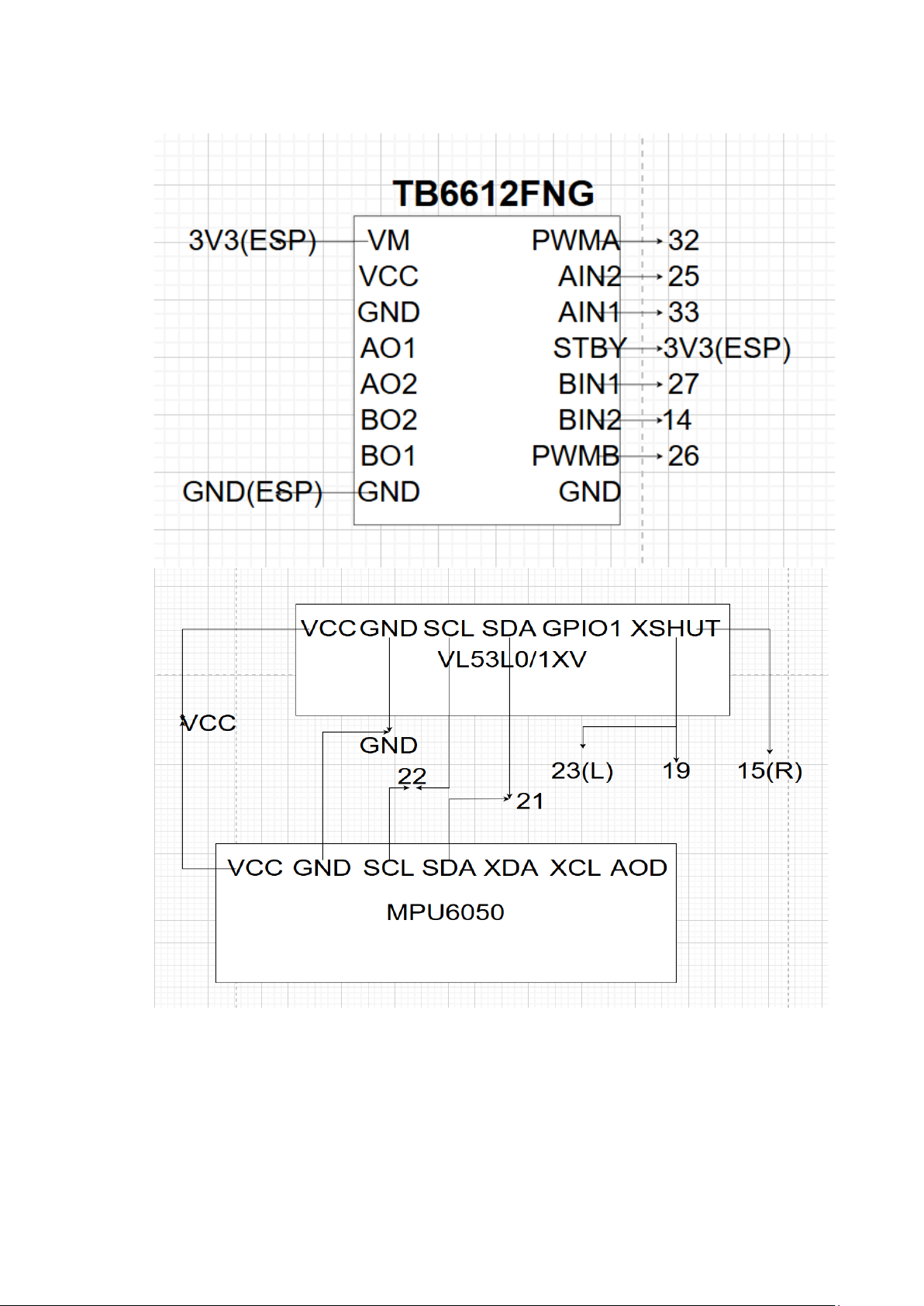 Cần điện trở kéo lên 2.2kΩ - I2C MPU6050 4.7kΩ cho bus ổn định. SCL VL53L0X (x3), GPIO 22 MPU6050 Động Cơ PWM A TB6612FNG GPIO 26 Output PWM. Trái AIN 1 TB6612FNG GPIO 25 Output Digital. AIN 2 TB6612FNG GPIO 33