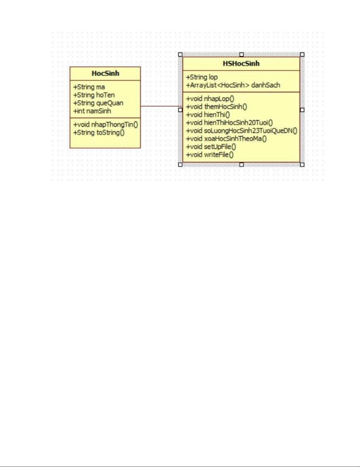 1.2.3. Thiết kế lớp 1.2.3.1. Thiết kế lớp a. Lớp HocSinh : Tên lớp : HocSinh.java Thuộc tính < String ma; String hoTen, queQuan; int namSinh; > Phương thức < public HocSinh() { }