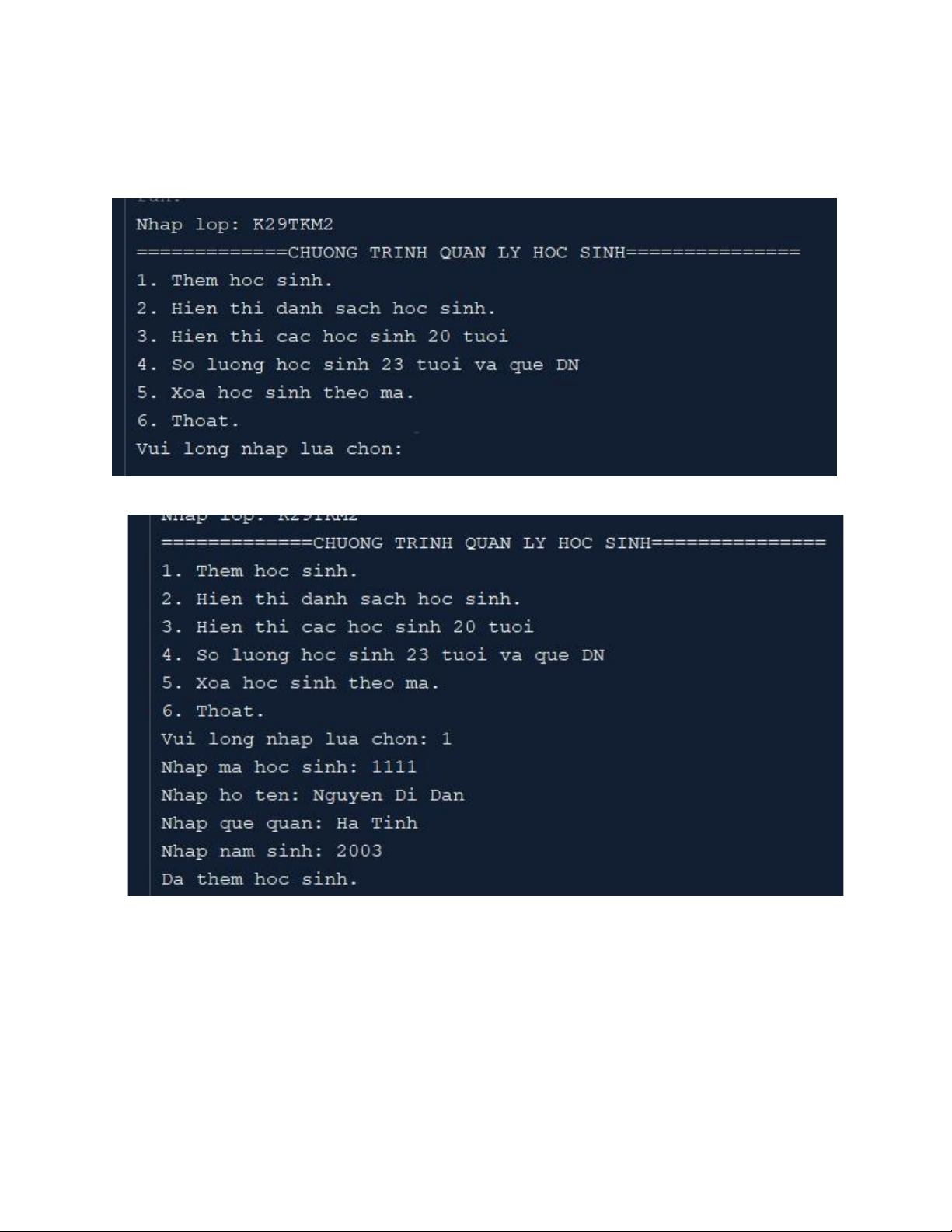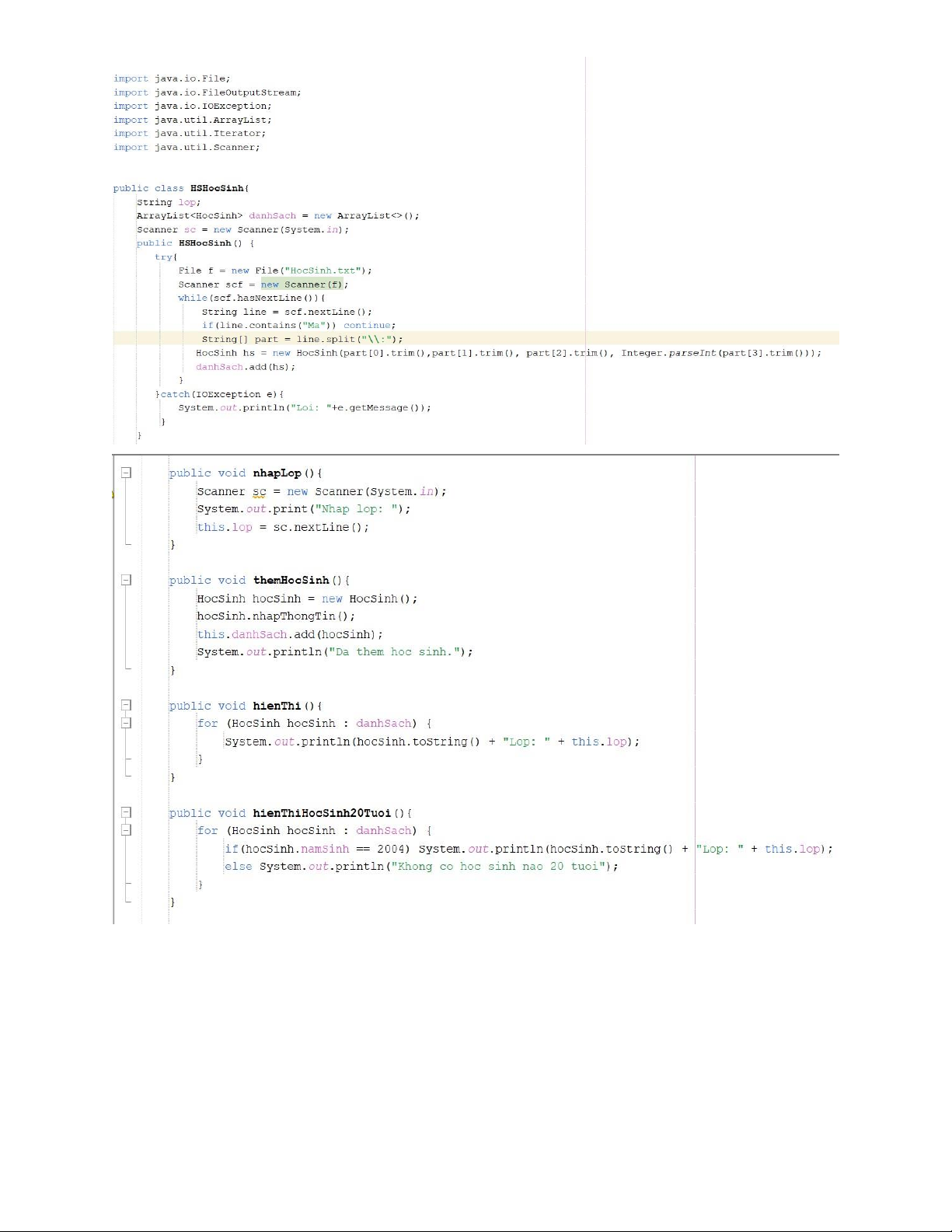 System.out.print("Nhap lop: "); this.lop = sc.nextLine(); } public void themHocSinh(){