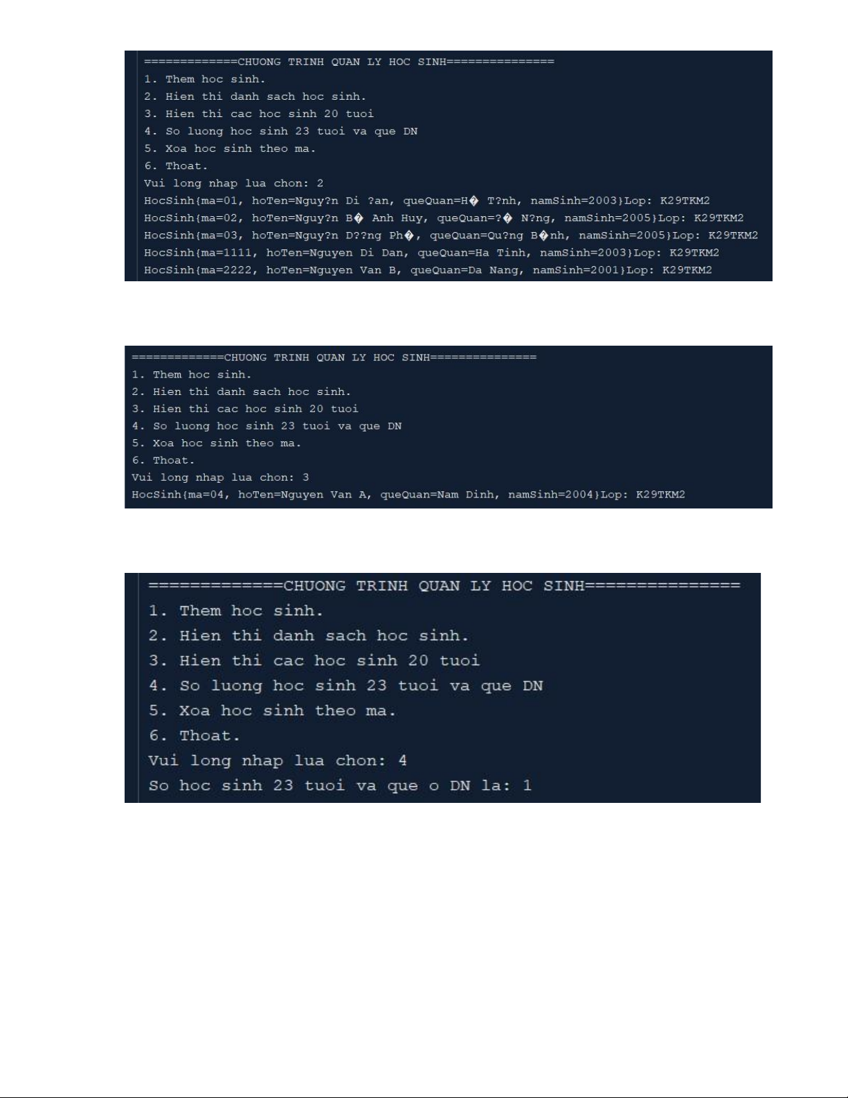 Cho biết số lượng các học sinh có tuổi là 23 và quê ở DN. Xoá học sinh theo mã. Thoát chương trình.