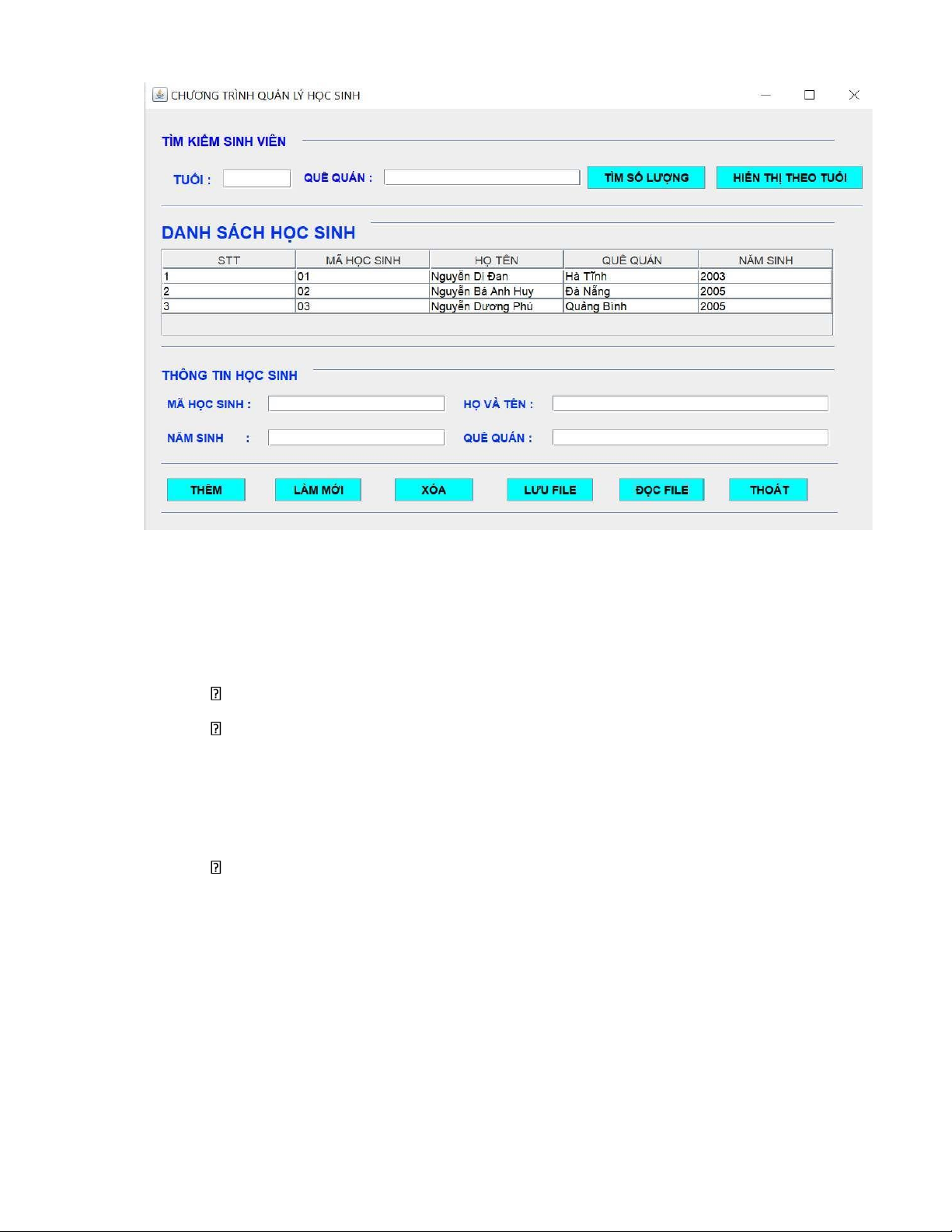Lựa chọn Hệ thống file văn bản, gồm các file: HocSinh.txt : Ma :HoTen :QueQuan :NamSinh 01 :Nguyễn Di Đan :Hà Tĩnh :2003 02 :Nguyễn Bá Anh Huy :Đà Nẵng :2005 03 :Nguyễn Dương Phú :Quảng Bình :2005 1.2.2. Đầu ra Xây dựng các lớp: +HocSinh class.