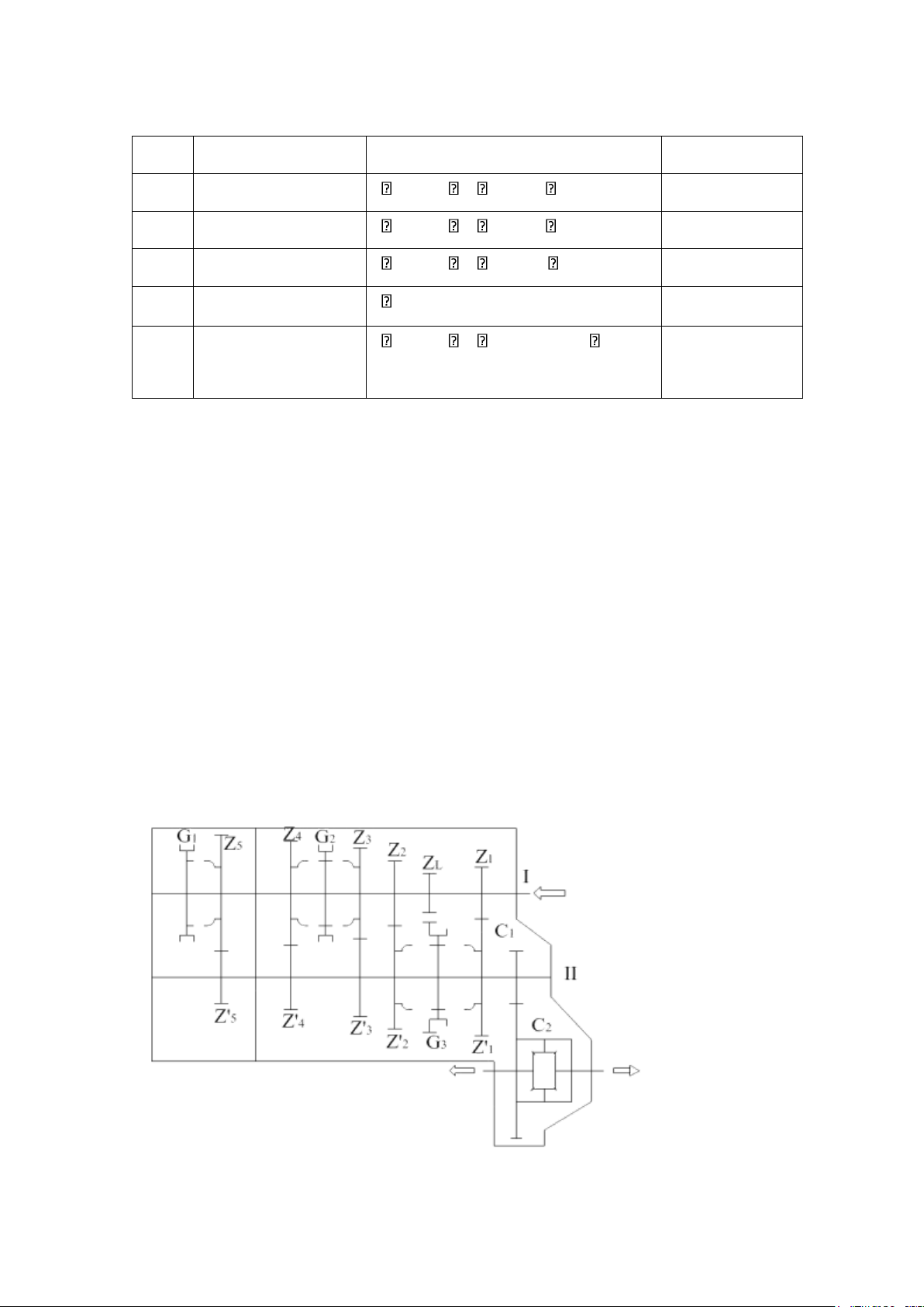 Bảng dòng truyền mô men của hộp số này:  Số Vị trí gài   Dòng truyền   Giá trị   1  G3, G2≡0; G1=1.  I1x2 II10x9  III  ih lớn nhất   2  G1, G3≡0; G2=2.  I1x2  II 7x8  III  ih trung gian   3  G1, G3≡0; G2=3.  I 1x2 II 6x5 III  ih trung gian   4  G1, G2≡0; G3=4.  I 1x2  II 3x4 III  ih trung gian   5  G1, G2≡0; G3=5.  I III  ih = 1  Lùi G3, G2≡0; G1=L