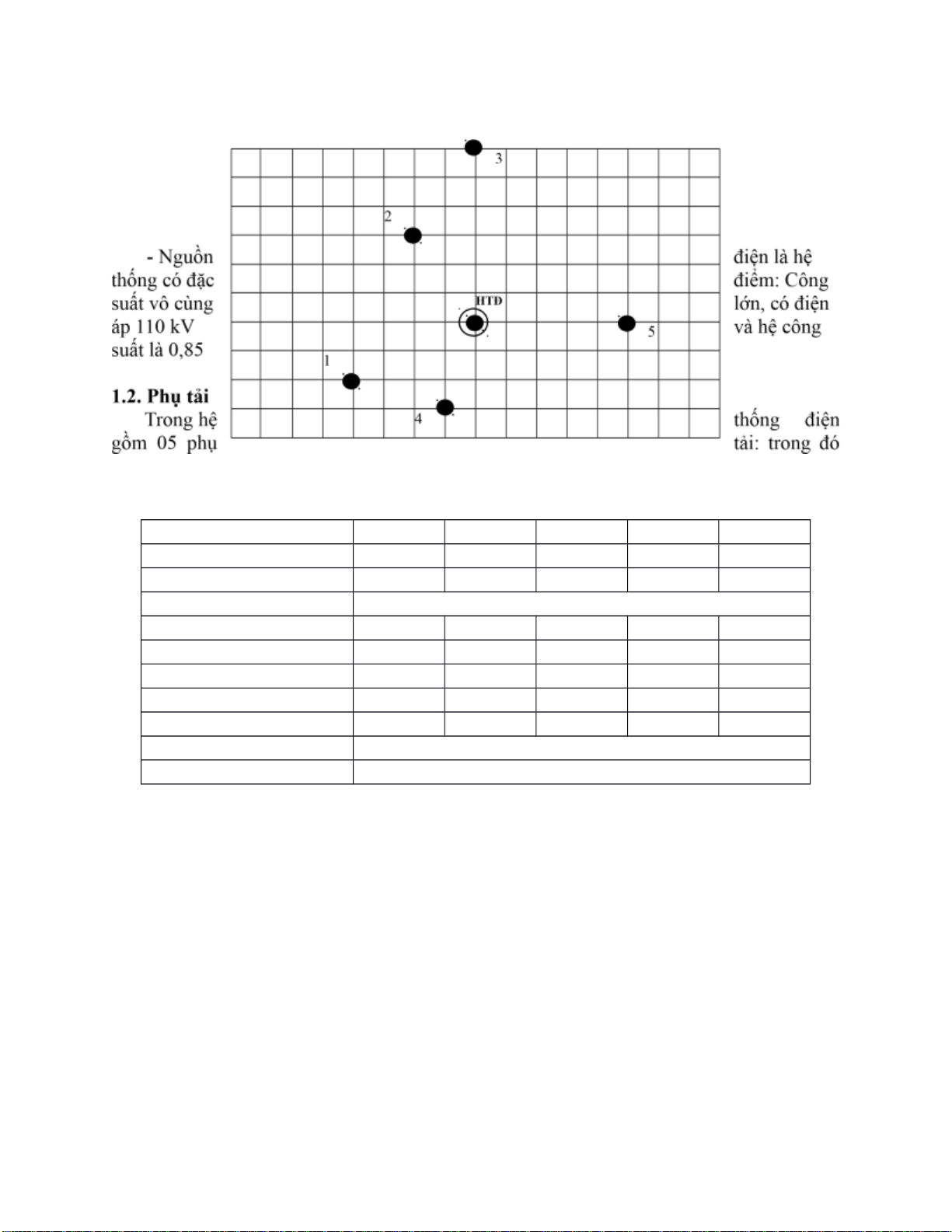 Sơ đồ phân bố phụ tải: Thông số 1 2 3 4 5 P max (MW) 32 21 28 23 46 P min 0 ,72 x P max cos φ 0 , 9 U đm ( kV ) 22 YCĐC điện áp