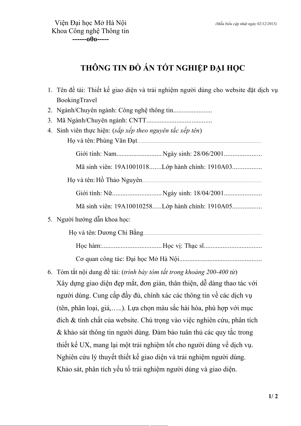 (Mẫu biểu cập nhật ngày 02/12/2015) Khoa Công nghệ Thông tin ------o0o-----