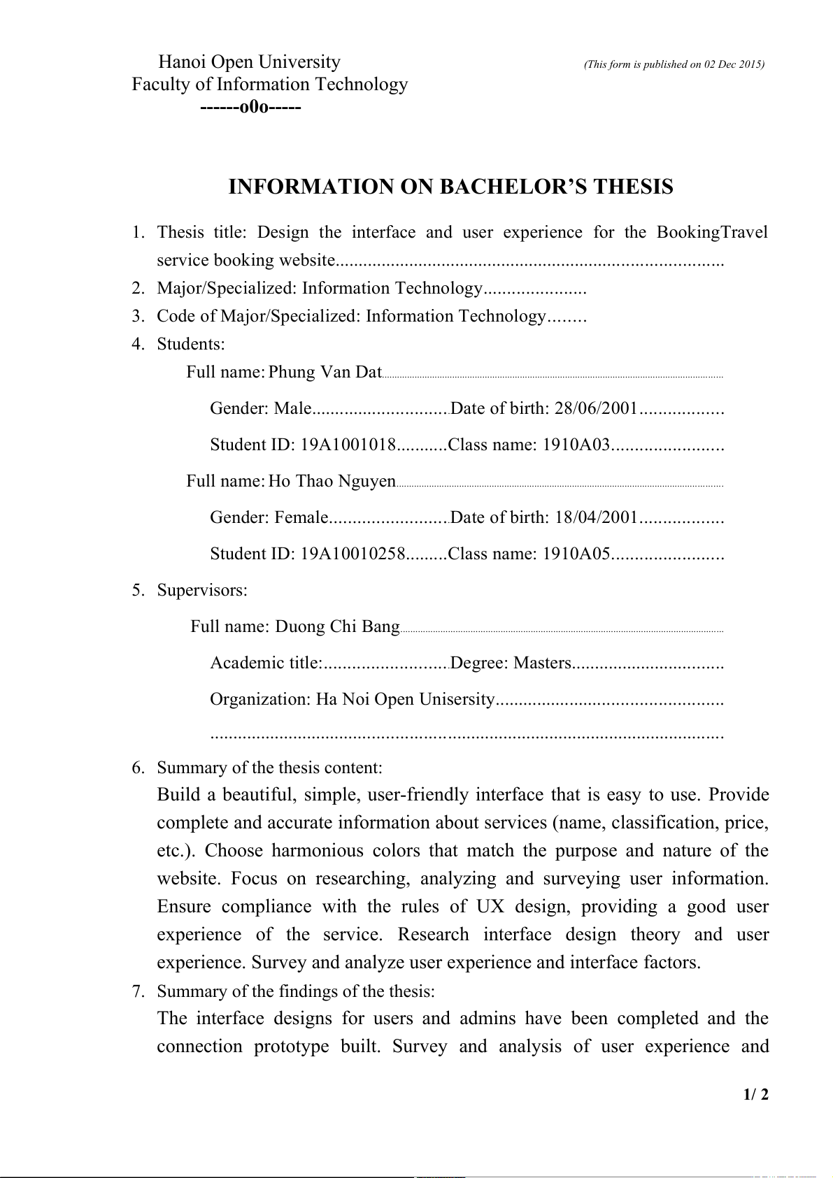 Student ID: 19A10010258.........Class name: 1910A05........................ 5. Supervisors: Full name: D