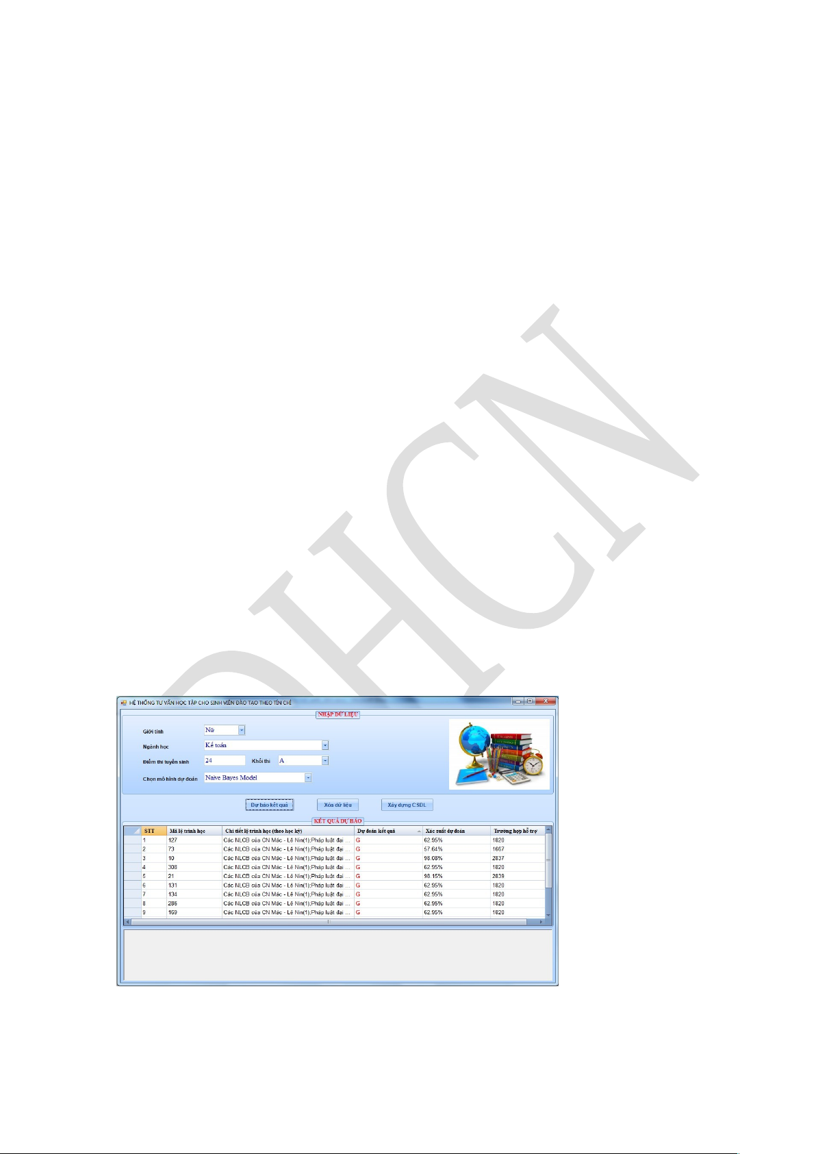 Sau khi đánh giá mô hình dự đoán tốt nhất, tác giả xây dựng chương trình thực nghiệm để hỗ trợ tư vấn học tập cho sinh viên năm đầu.
