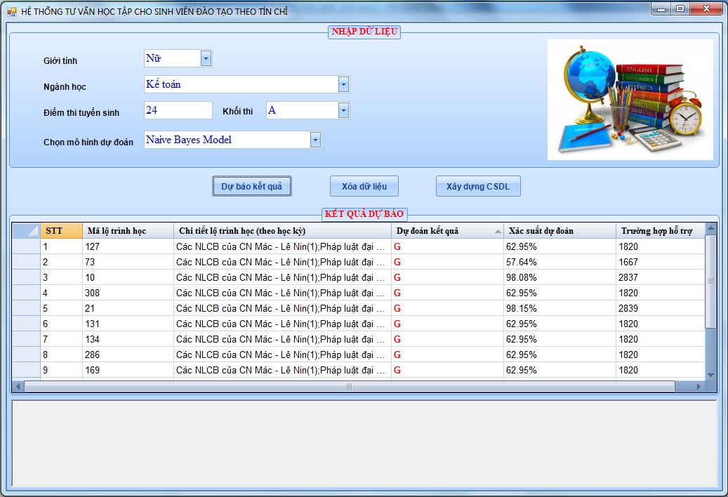 Xây dựng hệ thống tư vấn học tập với đầu vào là các thông tin cá nhân của sinh viên như: ngành học, điểm thi tuyển sinh, giới tính, sử dụng mô hình dự báo Naive Bayes.