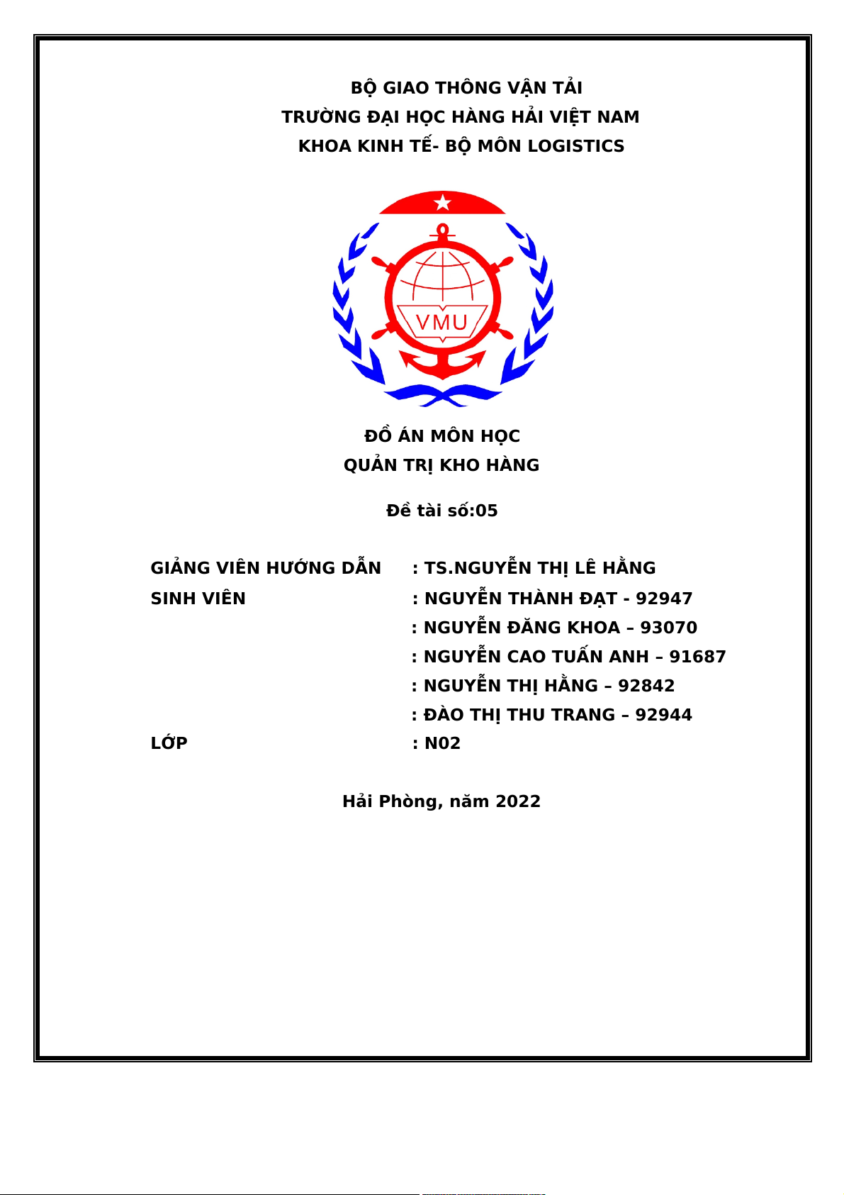 KHOA KINH TẾ- BỘ MÔN LOGISTICS ĐỒ ÁN MÔN HỌC QUẢN TRỊ KHO HÀNG Đề tài số:05