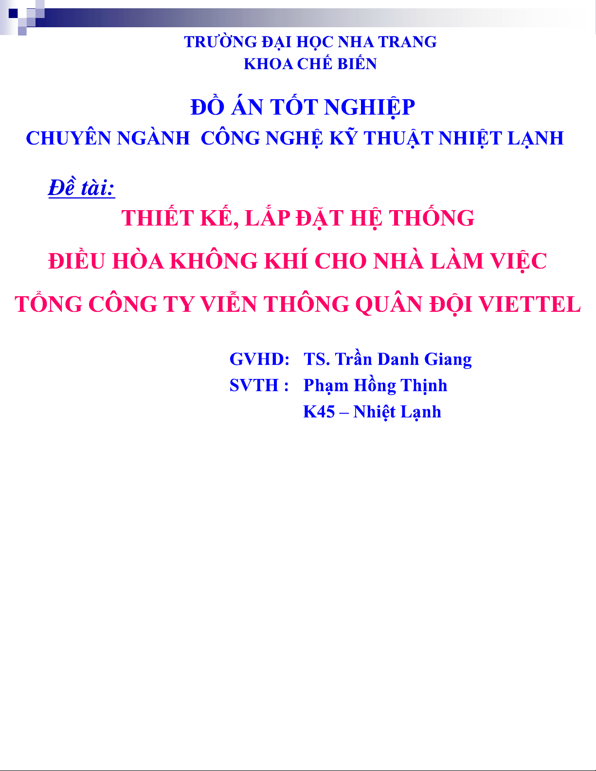 Đồ án tốt nghiệp Thiết kế hệ thống điều hòa không khí môn Công nghệ kỹ thuật nhiệt lạnh | Trường Đại học Nha Trang