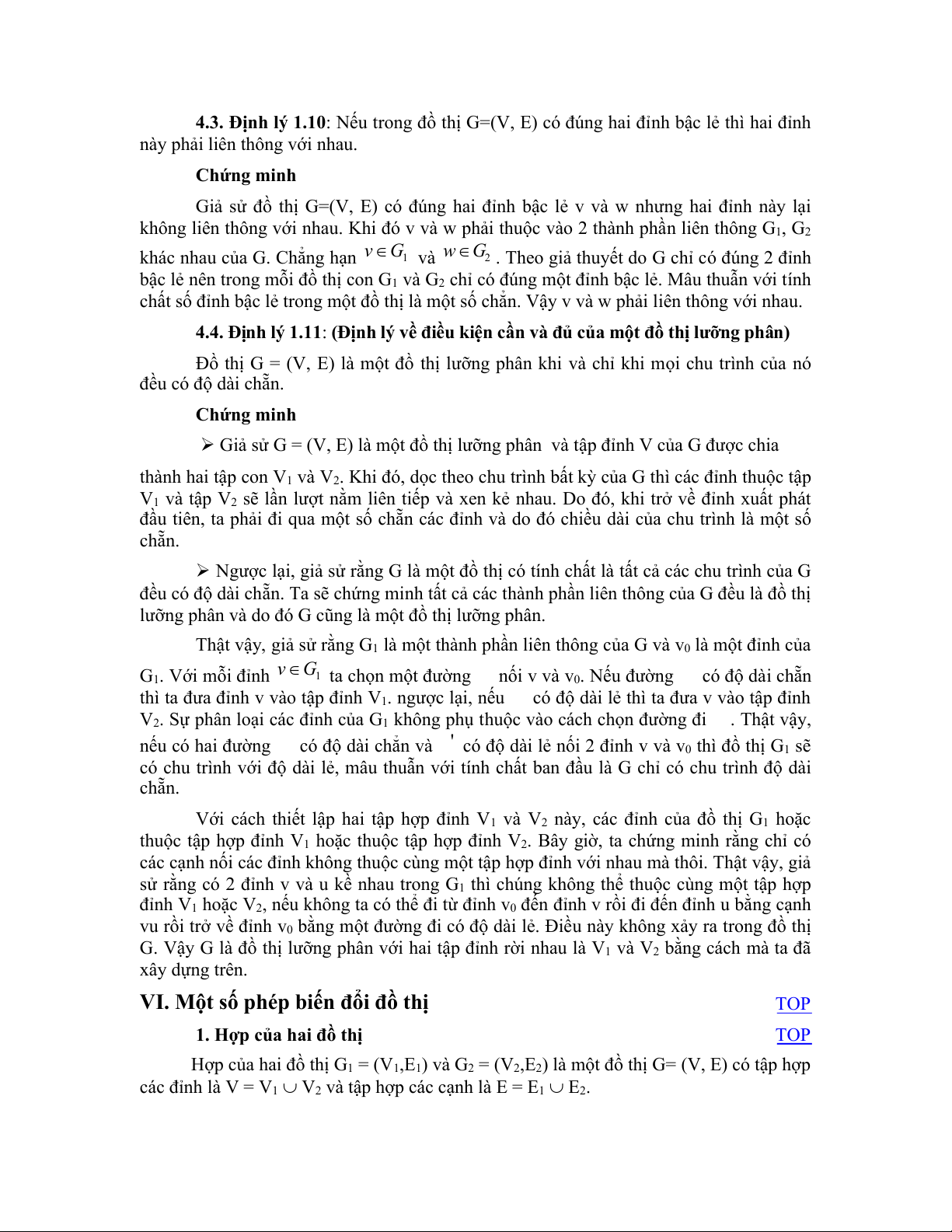 4.3. Định lý 1.10: Nếu trong đồ thị G=(V, E) có đúng hai đỉnh bậc lẻ thì hai đỉnh