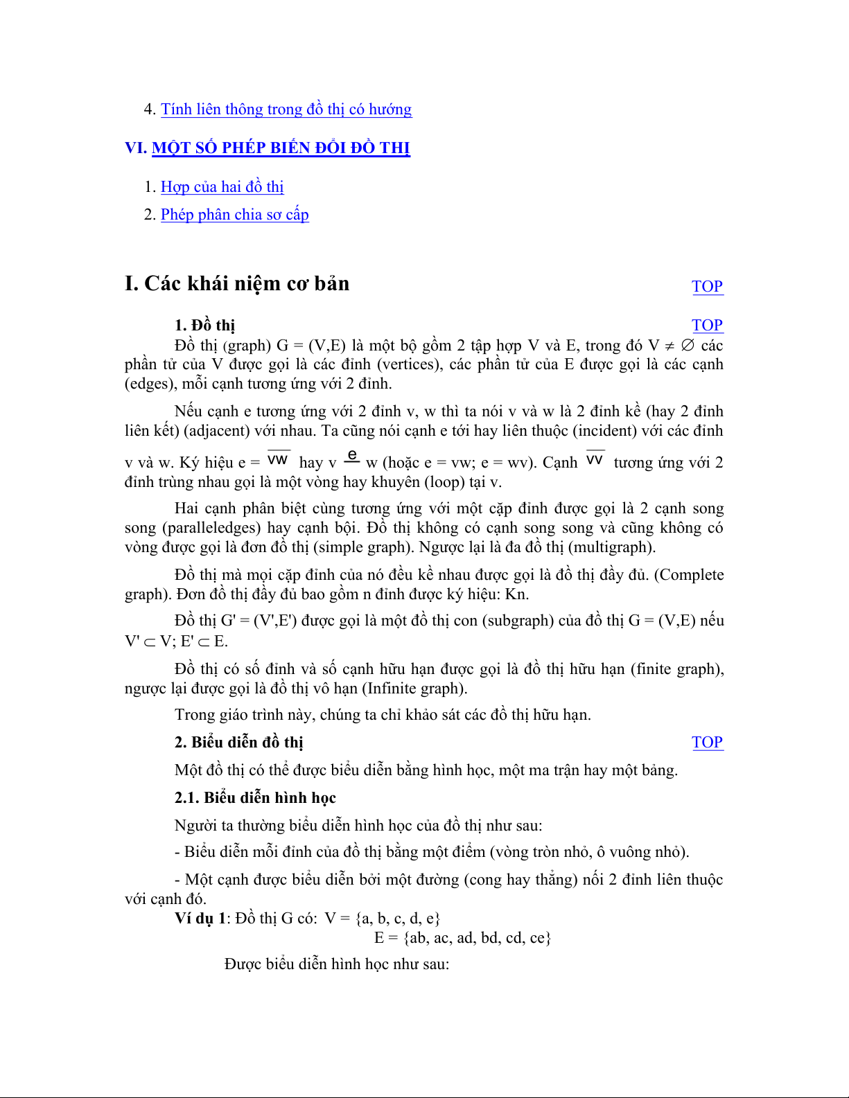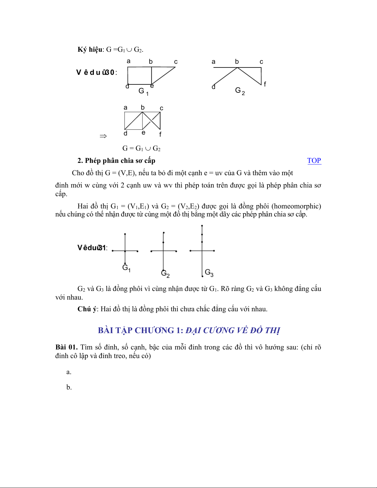 VI. MỘT SỐ PHÉP BIẾN ĐỔI ĐỒ THỊ 1. Hợp của hai đồ thị 2. Phép phân chia sơ cấp I. Các khái niệm cơ bản TOP 1. Đồ thị TOP