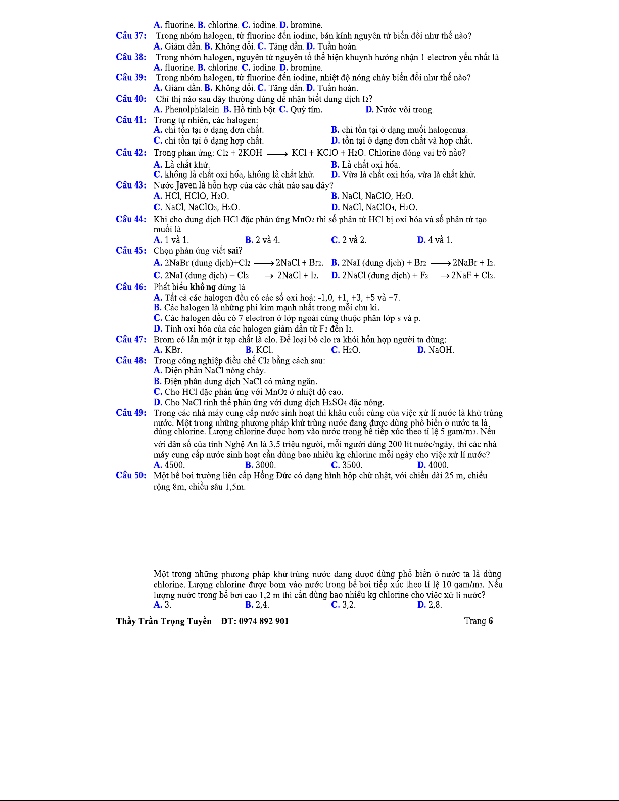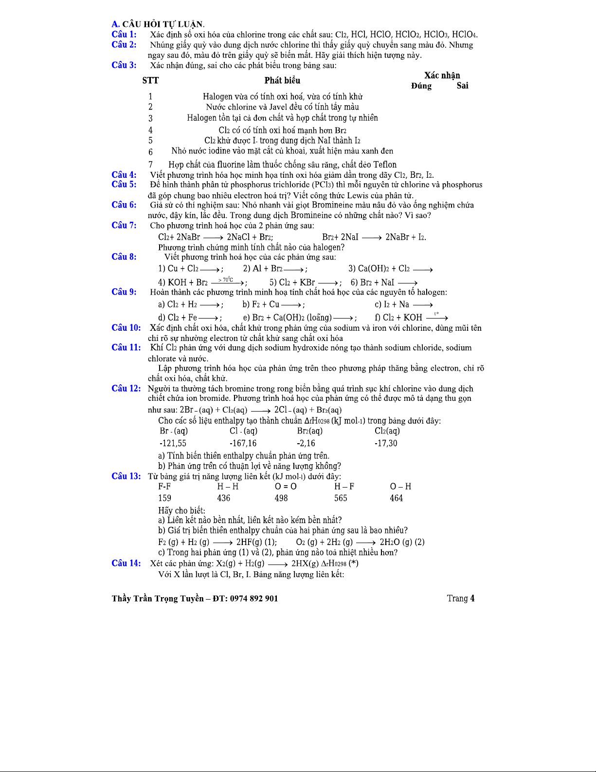 Đơn chất Halogen - Phần 1 - Câu hỏi Tự luận & Trắc nghiệm