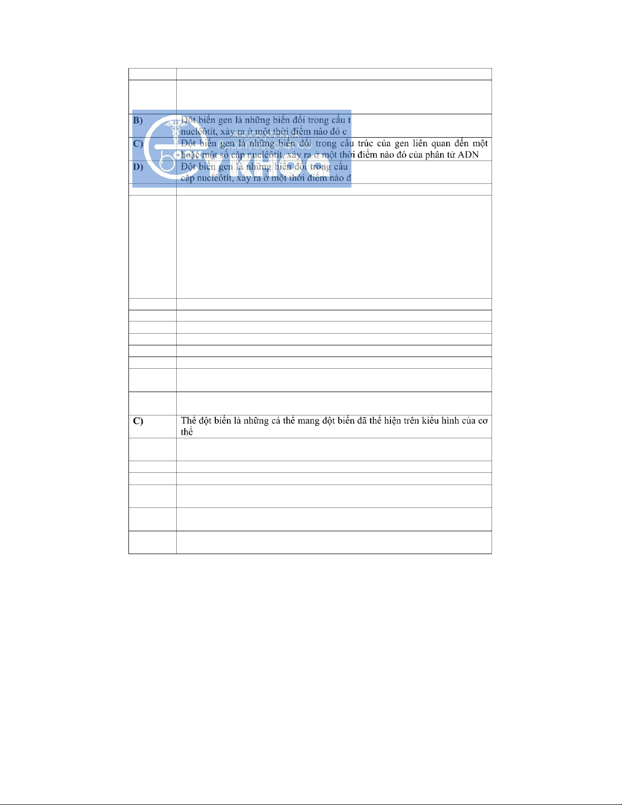 ðt bin là nhng bin ñi ca v9t cht di truy:n ñã th4 hiên trên ki4u hình ca cơ th4 ðáp án D Câu 5