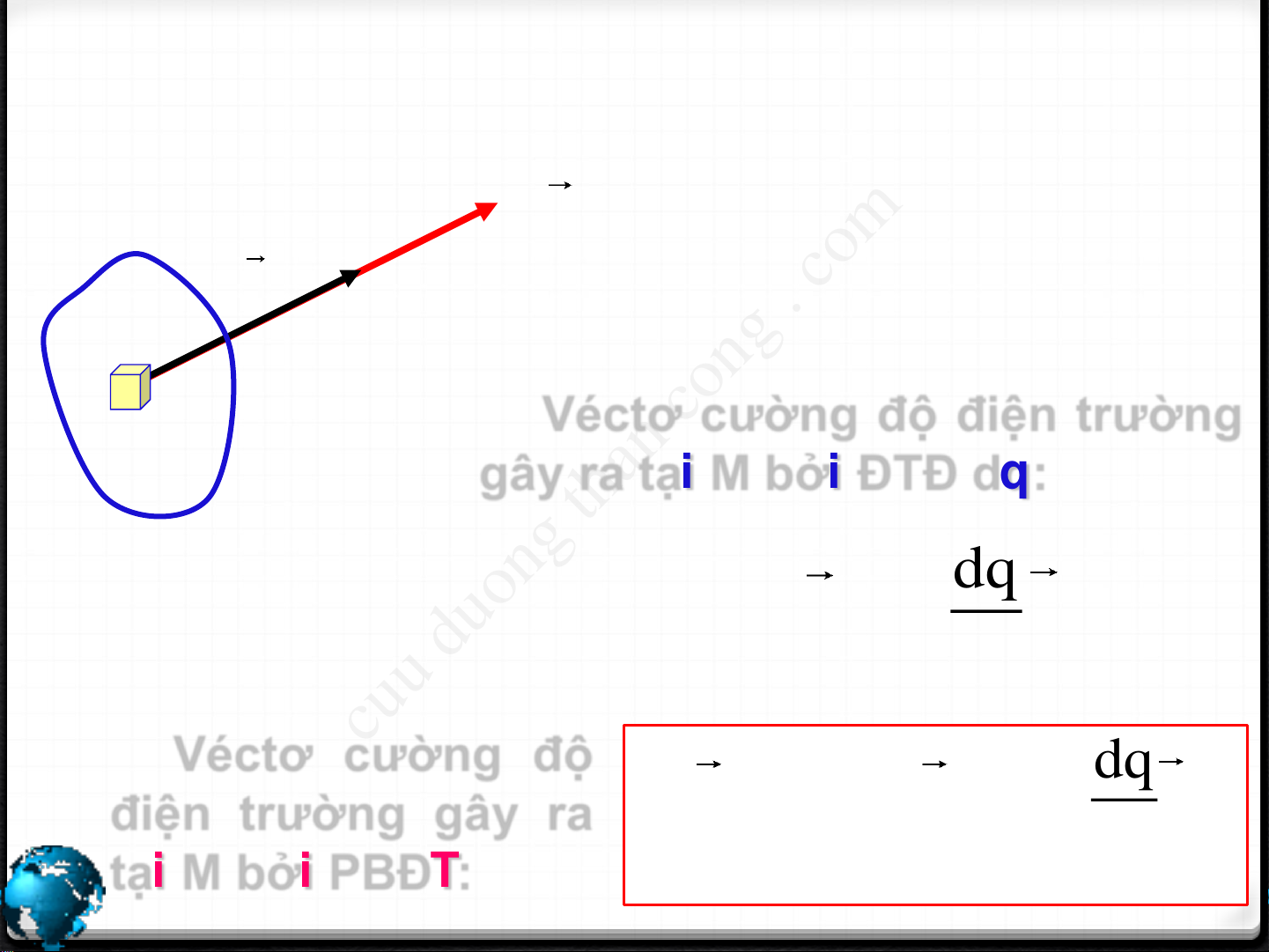 gây ra tại M bởi ĐTĐ dq: dq dE k r 3 r Véctơ cường độ cuu duong than cong . com dq điện trường gây ra E dE k r 3 tại r M bởi PBĐT: PBDT q CuuDuongThanCong.com