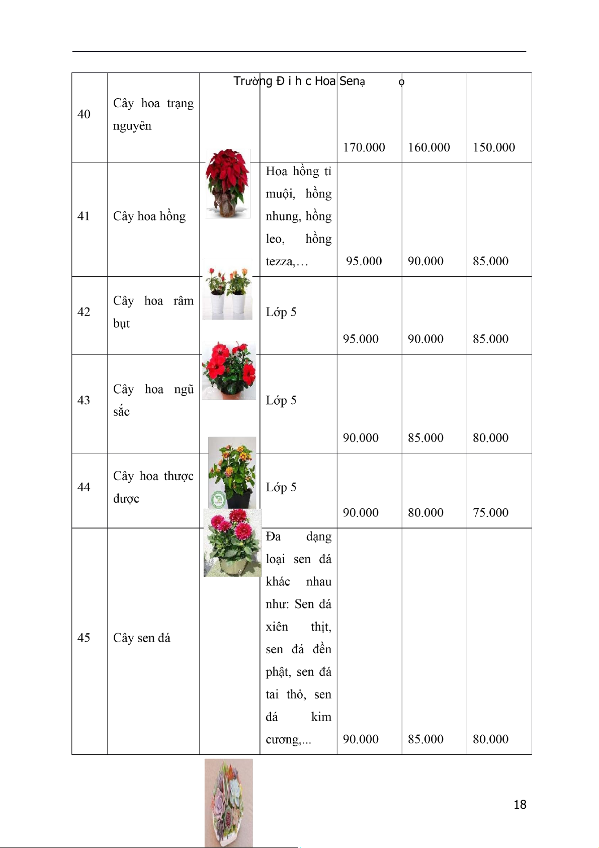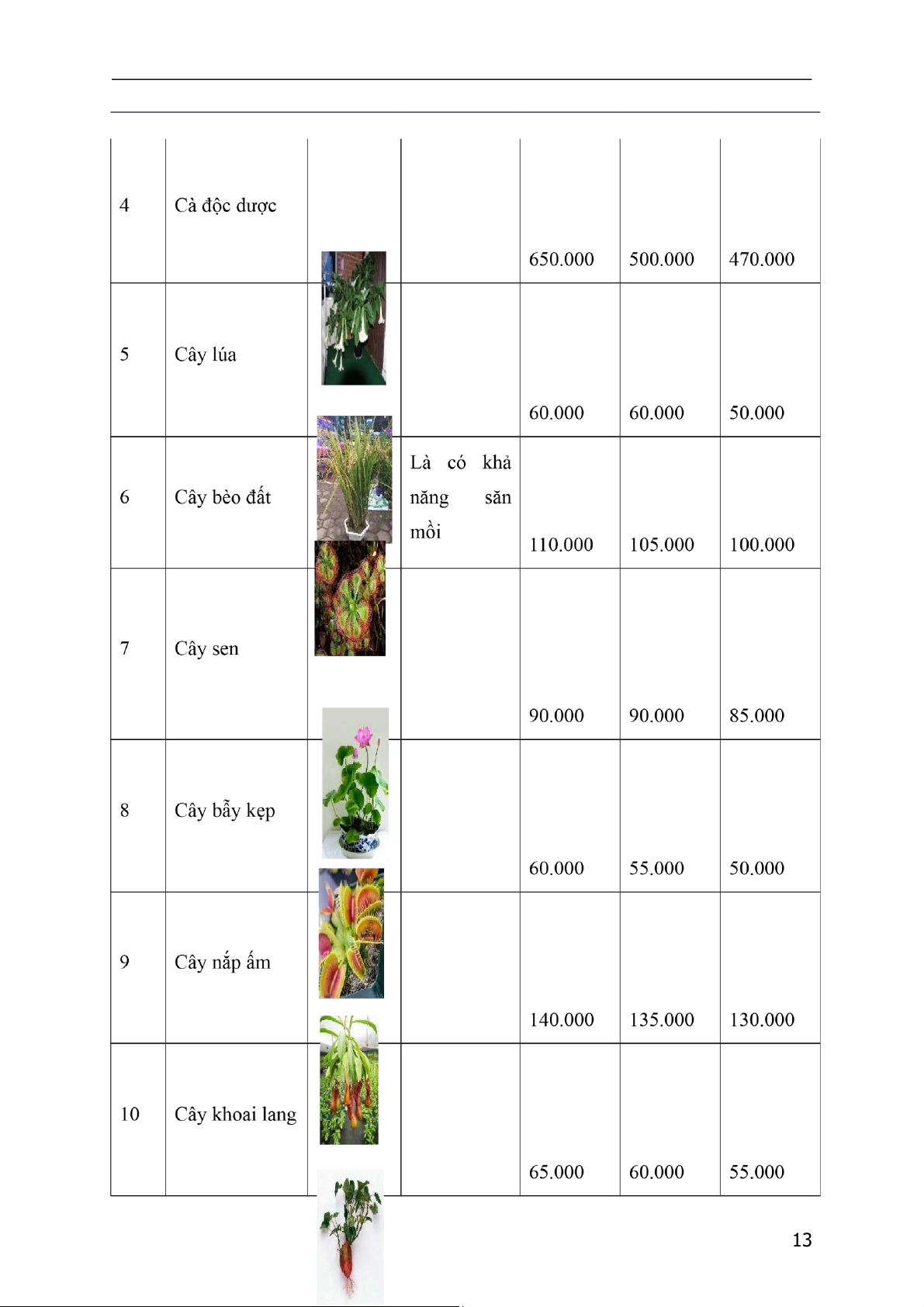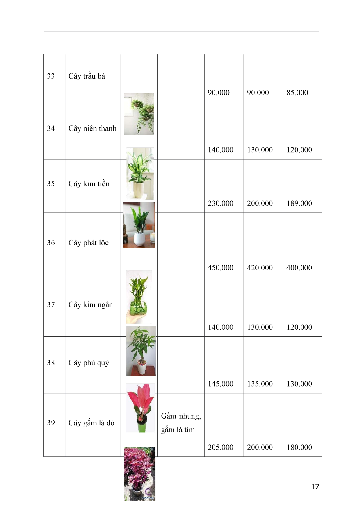 TÊN SẢN HÌNH SẢN Dưới 20 Trên 20 T PHẨM ẢNH GHI CHÚ PHẨM cây cây 1 Cây dương xỉ lớp 4 60.000 55.000 50000 Cây thiết mộc 2 lan 500.000 250.000 200.000 3 Cây trúc đào 250.000 200.000 180.000 12 lOMoAR cPSD| 47206521 Trường Đ i h c Hoa Senạ ọ 13 lOMoAR cPSD| 47206521 Trường Đ i h c Hoa Senạ ọ 14 lOMoAR cPSD| 47206521 Trường Đ i h c Hoa Senạ ọ 15 lOMoAR cPSD| 47206521 Trường Đ i h c Hoa Senạ ọ 16 lOMoAR cPSD| 47206521 Trường Đ i h c Hoa Senạ ọ 17 lOMoAR cPSD| 47206521 Trường Đ i h c Hoa Senạ ọ 18