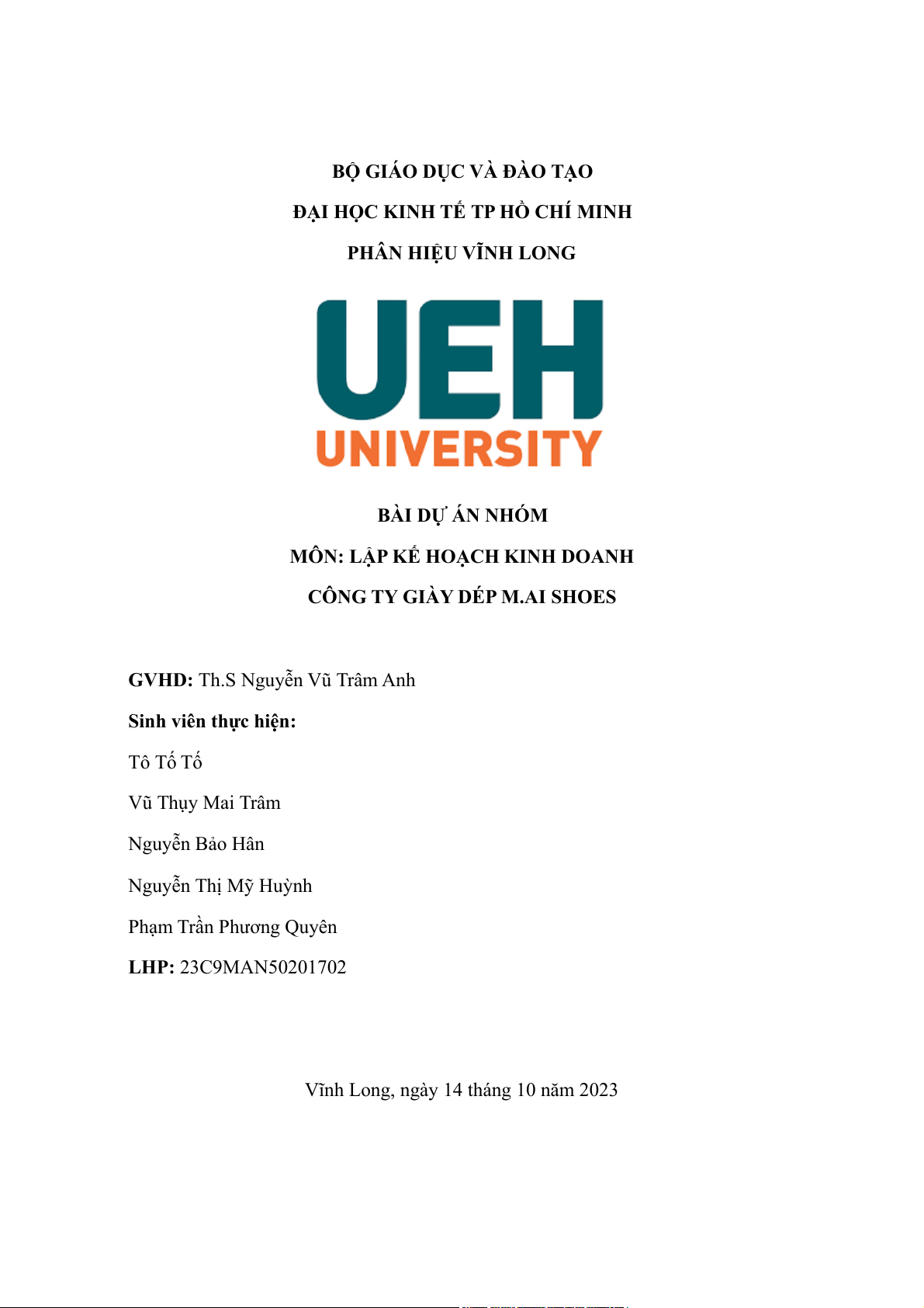 Vĩnh Long, ngày 14 tháng 10 năm 2023 HỌ VÀ TÊN TỶ LỆ ĐÓNG GÓP 1. Tô Tố Tố 100% 2. Vũ Thụy Mai Trâm 100% 3. Nguyễn Bảo Hân 100% 4. Nguyễn Thị Mỹ Huỳnh 100%