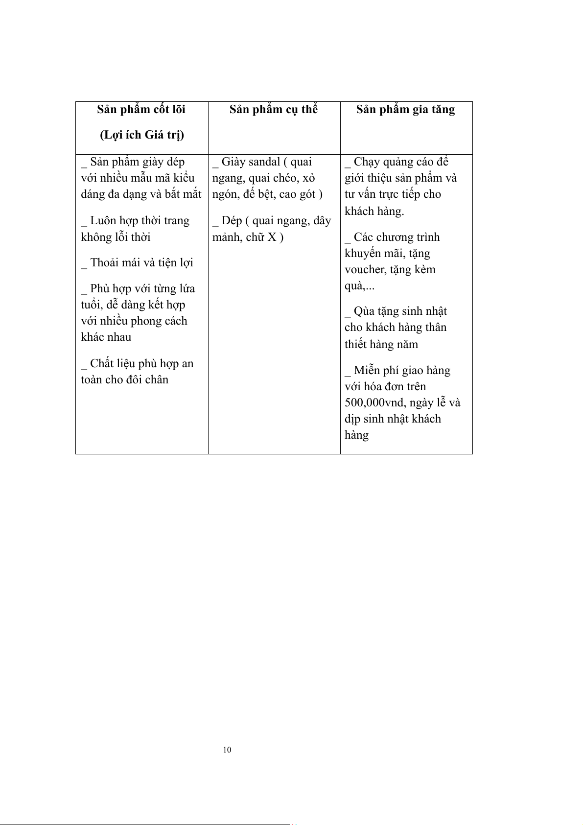 1. Đặc trưng của sản phẩm lập kế hoạch kinh doanh 9 Sản phẩm cốt lõi Sản phẩm cụ thể Sản phẩm gia tăng (Lợi ích Giá trị) _ Sản phẩm giày dép _ Giày sandal ( quai _ Chạy quảng cáo để