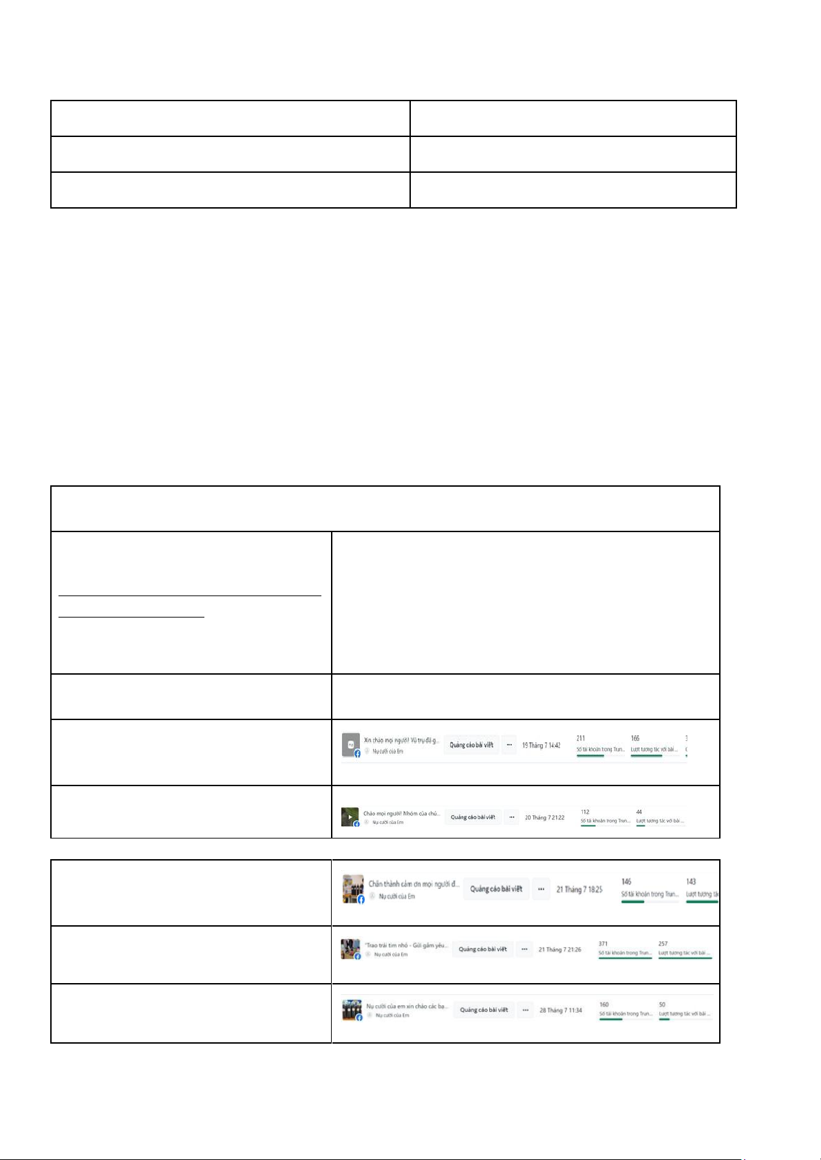 https://www.facebook.com/profile.php? id=100094513377890 Lượt tiếp cận Fanpage Bài viết số 1 Bài viết số 2 Bài viết số 3 Bài viết số 4 Bài viết số 5 lOMoAR cPSD| 59452058 Bài viết số 6 Bài viết số 7 Bài viết số 8 Bài viết số 9 Bài viết số 10 Bài viết số 11 Kênh Tik Tok