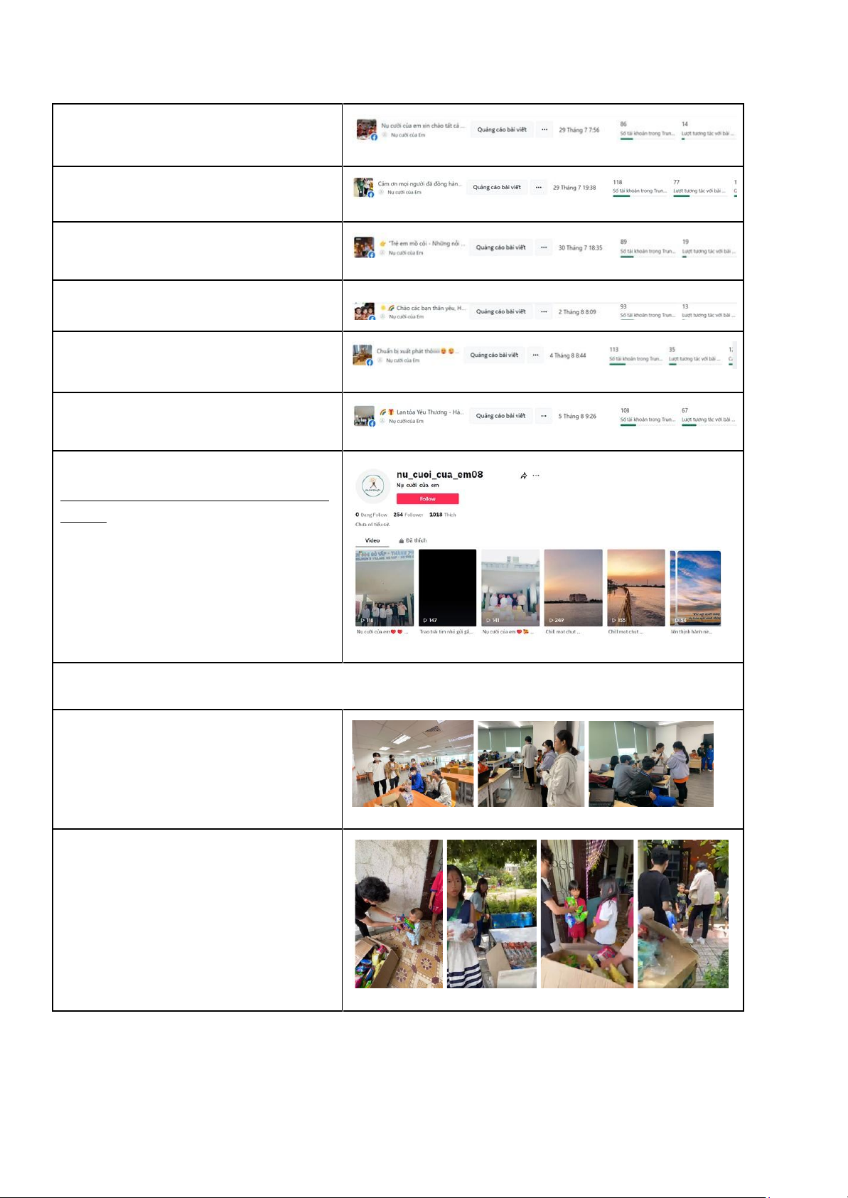 20/7/2023 20/7/2023 làng trẻ Đã Hoàn nắm bắt tình Đức Huy, SOS Gò Thành hình của em 100% Thanh Trúc, Vấp Nguyễn Linh Giai Chỉnh sửa Nhật Tiến 18/7/2023 30/7/2023 Facebook Đã đoạn hình ảnh Hoàn 2 Thành 100% Đăng video Kim Ngân, 18/7/2023 8/8/2023 TikTok Đã lên TikTok 6 Nhật Tiến, Hoàn video Thanh Trúc Thành 100%