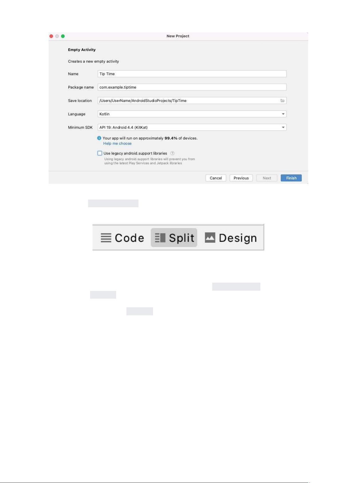 2. Đặt tên ứng dụng là "Tính tiền boa", với cấp độ API tối thiểu là 19 (KitKat). Tên gói là com.example.tiptime. lOMoAR cPSD| 58097008