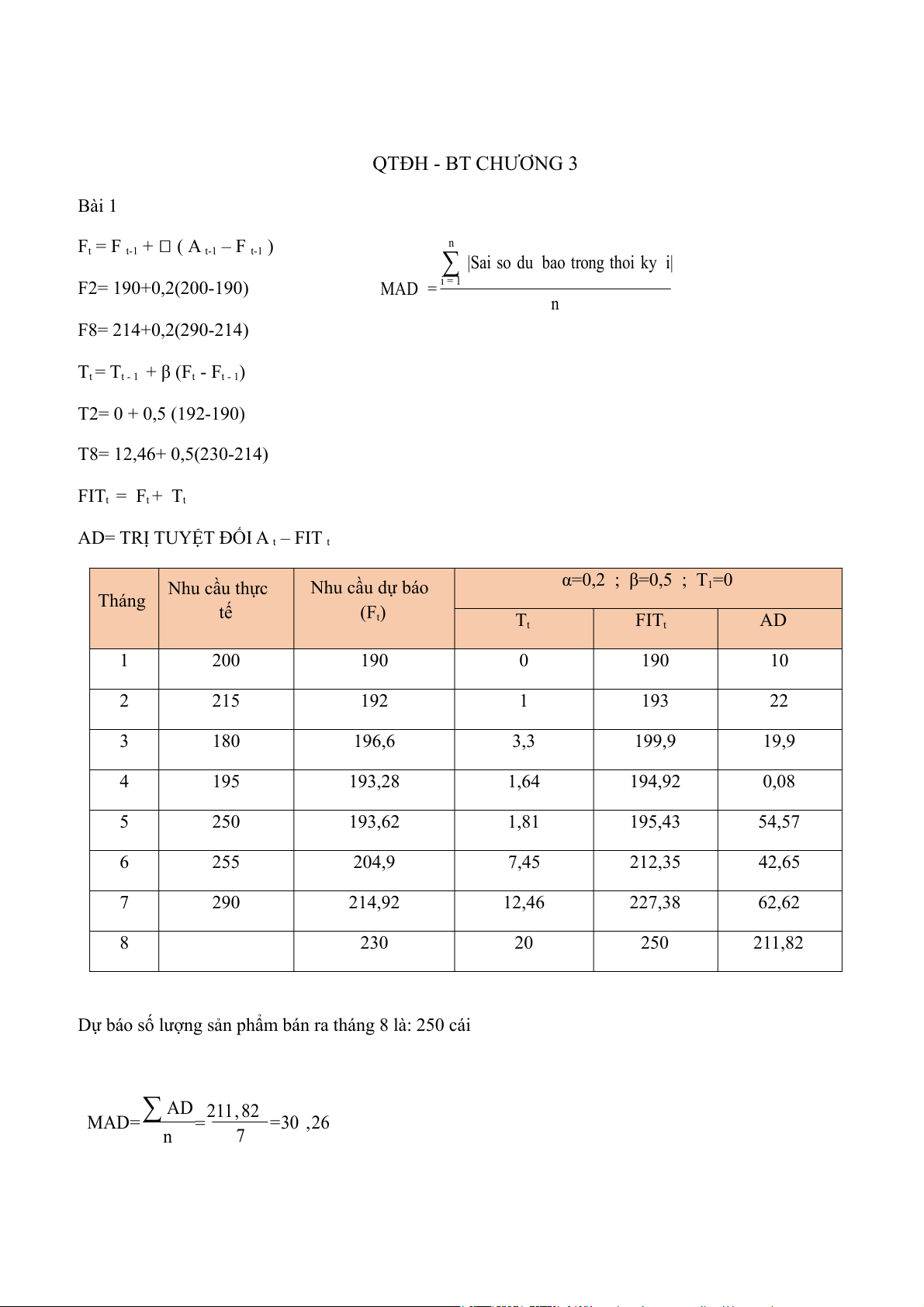 AD= TRỊ TUYỆT ĐỐI A t – FIT t Nhu cầu thực Nhu cầu dự báo α=0,2 ; β=0,5 ; T1=0 Tháng tế (Ft) Tt FITt AD 1 200 190 0 190 10 2 215 192 1 193 22 3 180 196,6 3,3 199,9 19,9 4 195 193,28 1,64 194,92 0,08 5 250 193,62 1,81 195,43 54,57 6 255 204,9 7,45 212,35 42,65 7 290 214,92 12,46 227,38 62,62 8 230 20 250 211,82