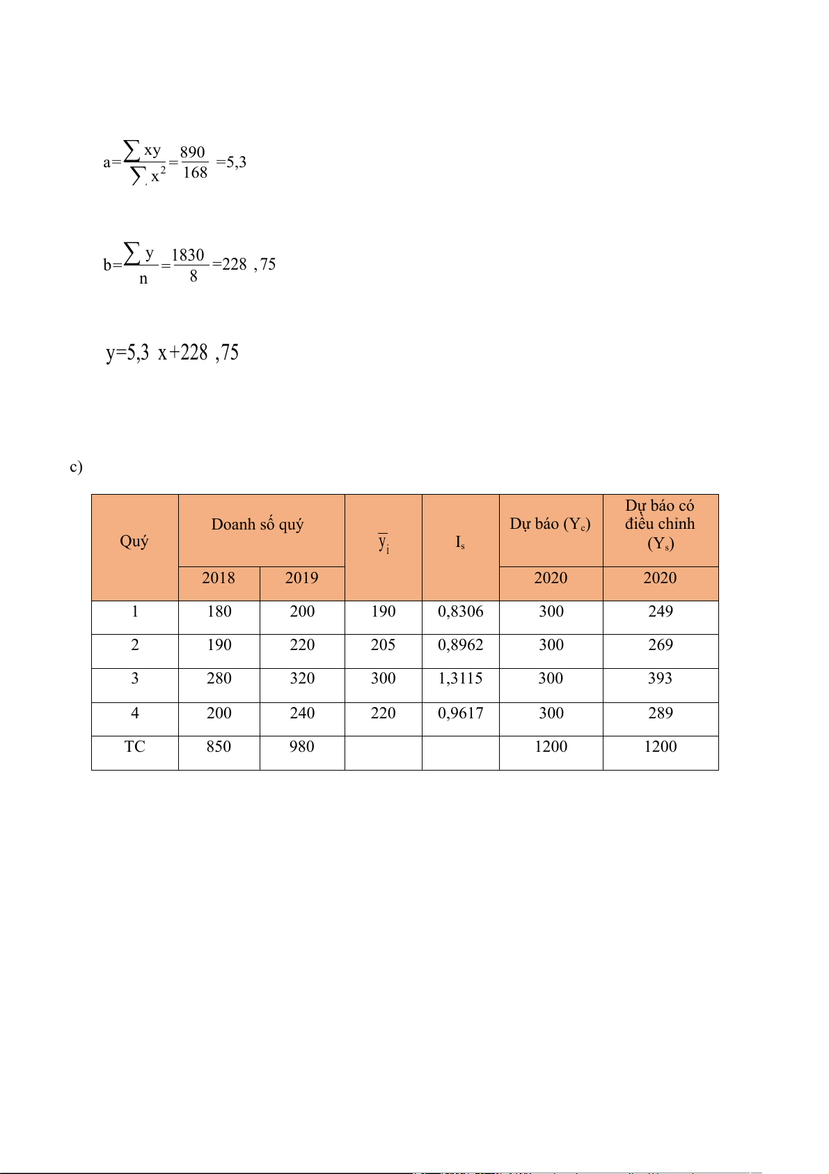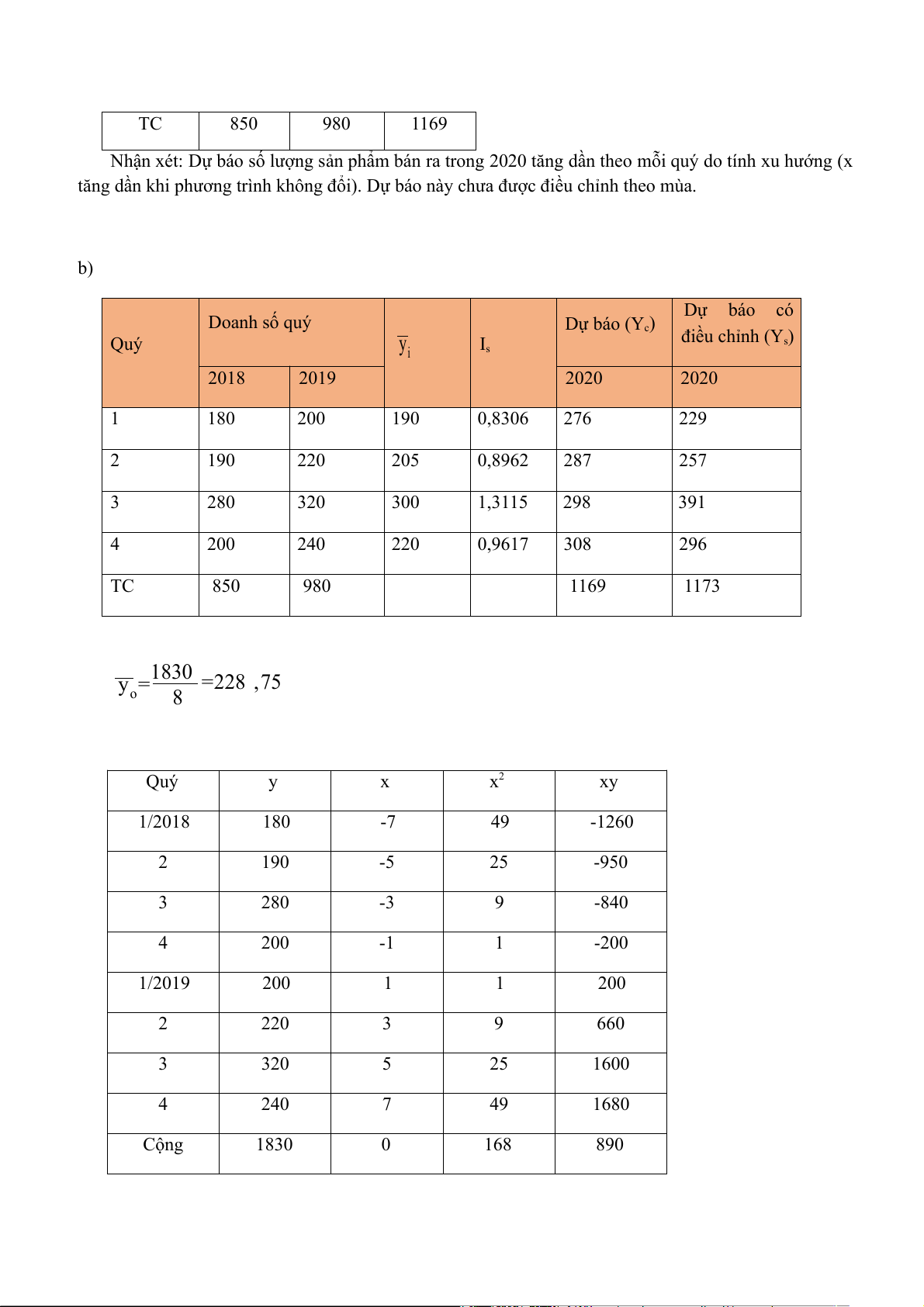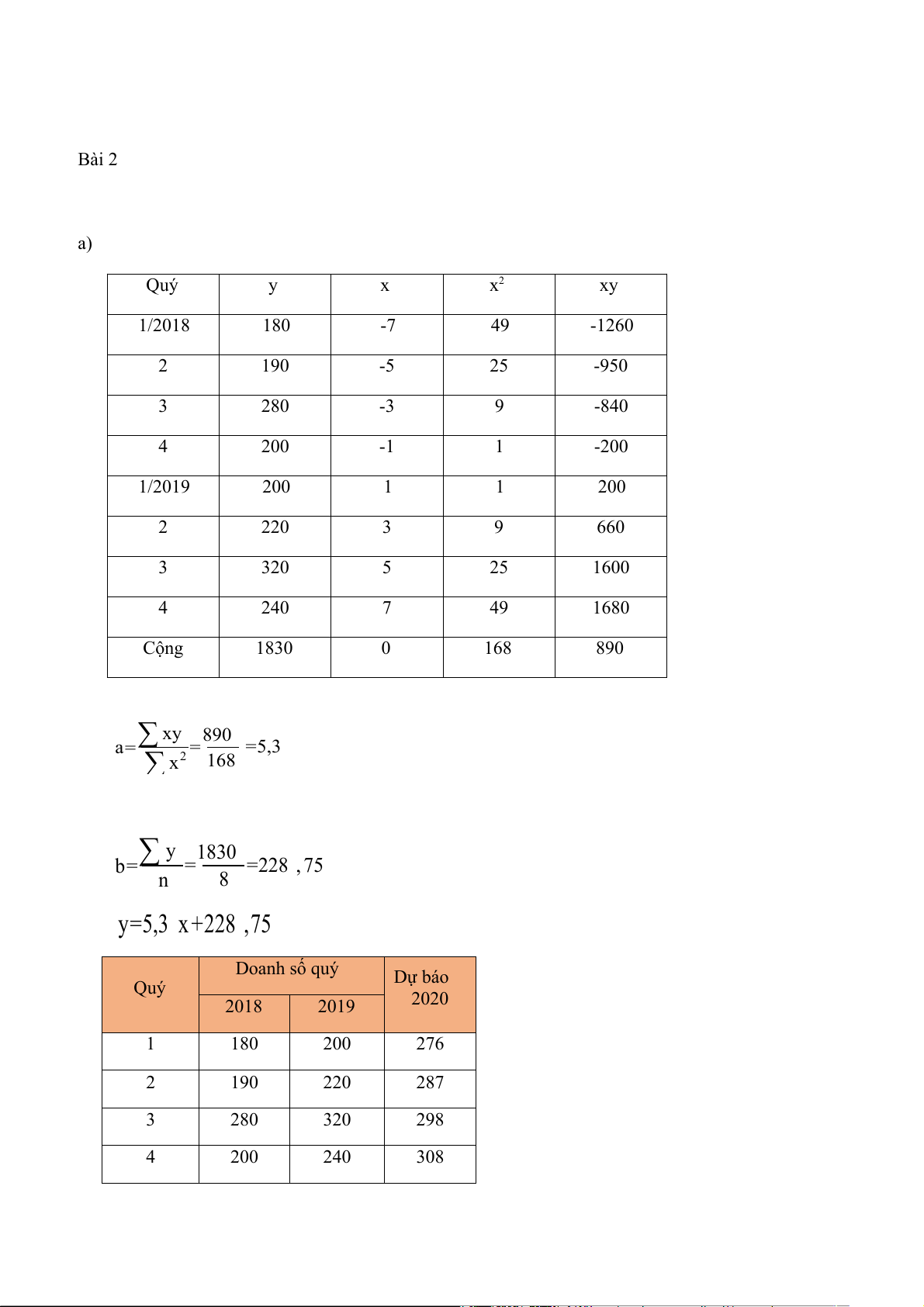 Dự báo số lượng sản phẩm bán ra tháng 8 là: 250 cái ∑ AD 211,82 MAD= = =30 ,26 n 7 Bài 2 a) Quý y x x2 xy 1/2018 180 -7 49 -1260 2 190 -5 25 -950 3 280 -3 9 -840 4 200 -1 1 -200 1/2019 200 1 1 200 2 220 3 9 660 3 320 5 25 1600 4 240 7 49 1680 Cộng 1830 0 168 890 ∑ xy 890 a= =5,3 ∑ = x2 168 ∑ y 1830 b= = =228 , 75 n 8 y=5,3 x+228 ,75 Doanh số quý Dự báo Quý 2020 2018 2019 1 180 200 276 2 190 220 287 3 280 320 298 4 200 240 308 TC 850 980 1169