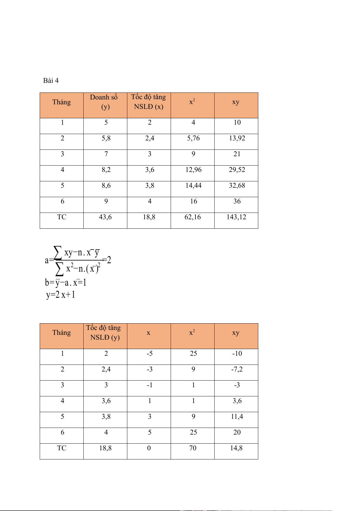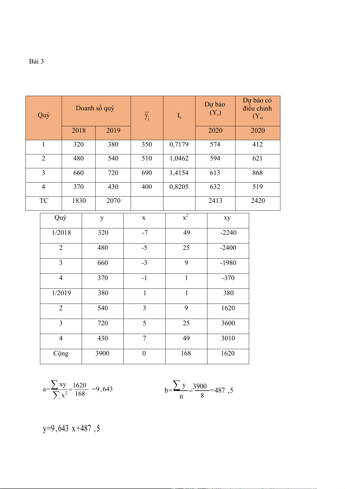 tăng dần khi phương trình không đổi). Dự báo này chưa được điều chỉnh theo mùa. b) Dự báo có Doanh số quý Dự báo (Yc) Quý y I điều chỉnh (Ys) i s 2018 2019 2020 2020 1 180 200 190 0,8306 276 229 2 190 220 205 0,8962 287 257 3 280 320 300 1,3115 298 391 4 200 240 220 0,9617 308 296 TC 850 980 1169 1173 1830 y = =228 ,75 o 8 Quý y x x2 xy 1/2018 180 -7 49 -1260 2 190 -5 25 -950 3 280 -3 9 -840 4 200 -1 1 -200 1/2019 200 1 1 200 2 220 3 9 660 3 320 5 25 1600 4 240 7 49 1680 Cộng 1830 0 168 890 ∑ xy 890 a= =5,3 ∑ = x2 168 ∑ y 1830 b= = =228 , 75 n 8 y=5,3 x+228 ,75 c) Dự báo có Doanh số quý Dự báo (Yc) điều chỉnh Quý y I i s (Ys) 2018 2019 2020 2020 1 180 200 190 0,8306 300 249 2 190 220 205 0,8962 300 269 3 280 320 300 1,3115 300 393 4 200 240 220 0,9617 300 289 TC 850 980 1200 1200 Bài 3 Dự báo có Doanh số quý Dự báo điều chỉnh Quý y I (Yc) i s (Ys) 2018 2019 2020 2020 1 320 380 350 0,7179 574 412 2 480 540 510 1,0462 594 621 3 660 720 690 1,4154 613 868 4 370 430 400 0,8205 632 519 TC 1830 2070 2413 2420 Quý y x x2 xy 1/2018 320 -7 49 -2240 2 480 -5 25 -2400 3 660 -3 9 -1980 4 370 -1 1 -370 1/2019 380 1 1 380 2 540 3 9 1620 3 720 5 25 3600 4 430 7 49 3010 Cộng 3900 0 168 1620 ∑ xy ∑ y a= 1620 =9,643 3900 ∑ = b= = =487 ,5 x2 168 n 8 y=9,643 x+487 ,5 Bài 4 Doanh số Tốc độ tăng Tháng x2 xy (y) NSLĐ (x) 1 5 2 4 10 2 5,8 2,4 5,76 13,92 3 7 3 9 21 4 8,2 3,6 12,96 29,52 5 8,6 3,8 14,44 32,68 6 9 4 16 36 TC 43,6 18,8 62,16 143,12 ∑ xy−n.x y a= ∑ =2 x2−n.( x )2 b= y−a. x=1 y=2 x+1 Tốc độ tăng Tháng x x2 xy NSLĐ (y) 1 2 -5 25 -10 2 2,4 -3 9 -7,2 3 3 -1 1 -3 4 3,6 1 1 3,6 5 3,8 3 9 11,4 6 4 5 25 20 TC 18,8 0 70 14,8 ∑ xy a '= 14 ,8 =0,2114 ∑ = x2 70 ∑ y b '= 18 ,8 = =3 ,133 n 6 y ' =0 ,2114 x+3 ,133