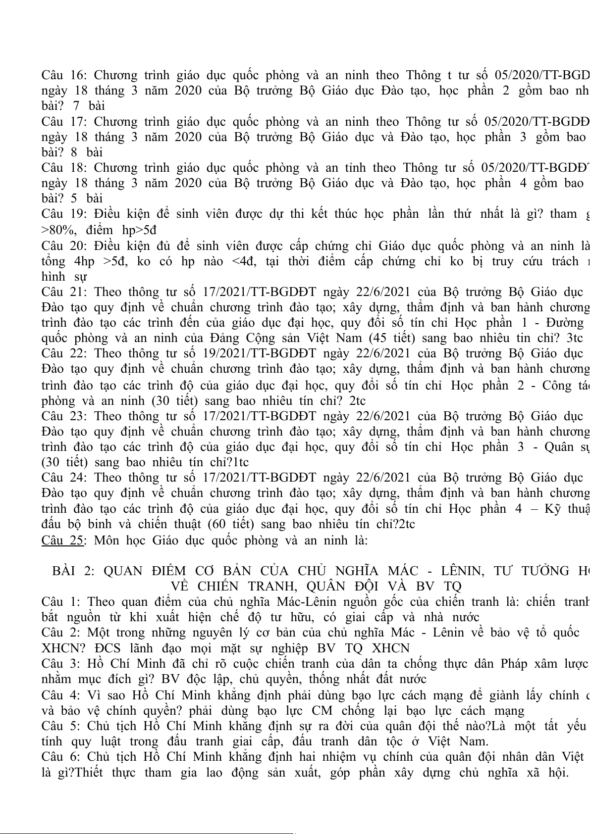 Câu 17: Chương trình giáo dục quốc phòng và an ninh theo Thông tư số 05/2020/TT-BGDĐ