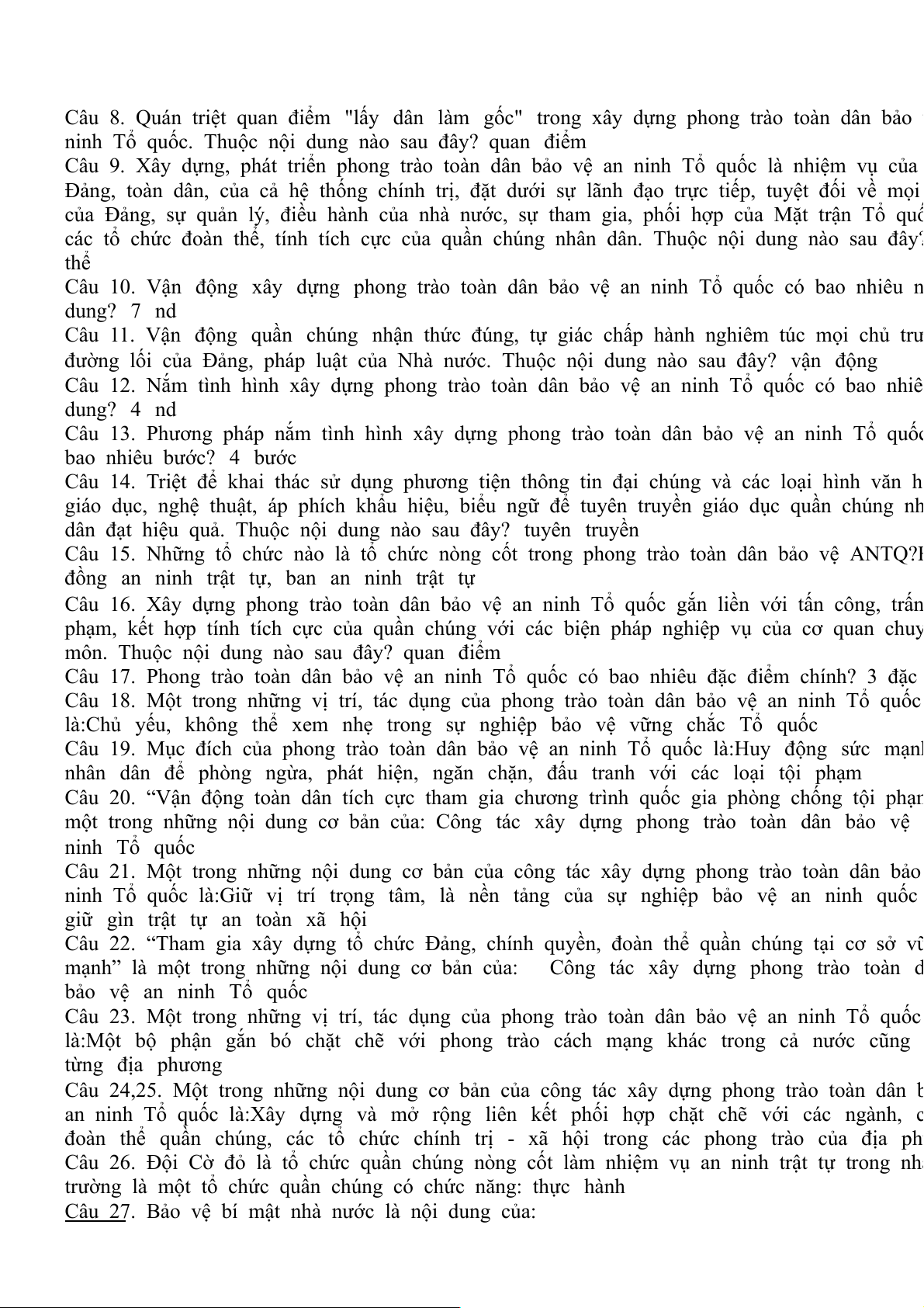 Câu 12. Nắm tình hình xây dựng phong trào toàn dân bảo vệ an ninh Tổ quốc có bao nhiêu dung? 4 nd