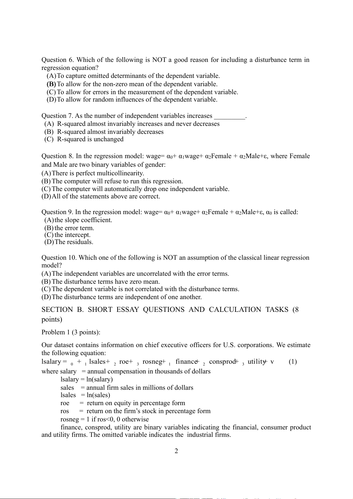 Question 9. In the regression model: wage= α0+ α1wage+ α2Female + α2Male+ε, α0 is called: (A) the slope coefficient. (B) the error term. (C) the intercept. (D) The residuals.