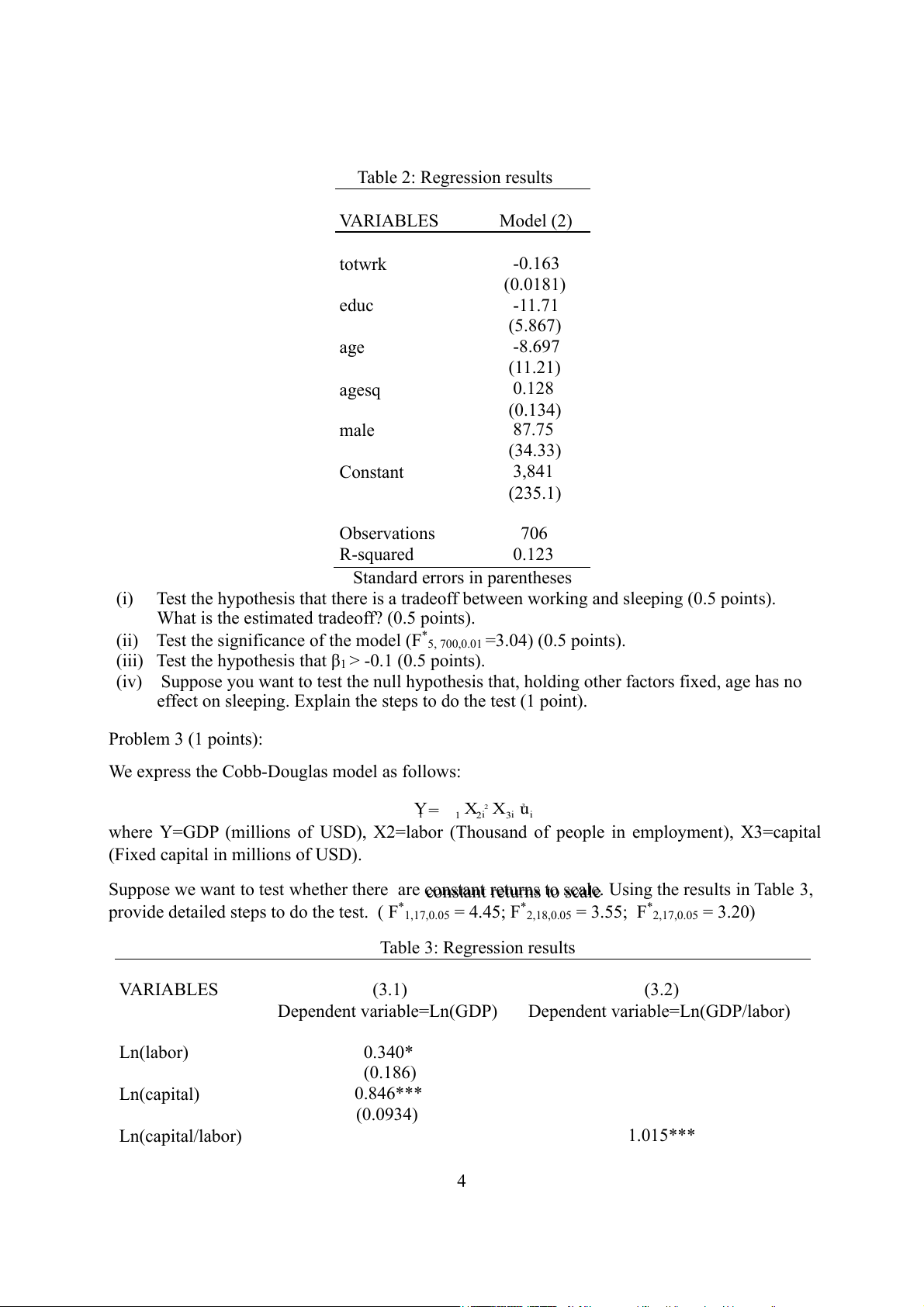 The results are presented in Table 2 3 Table 2: Regression results VARIABLES Model (2) totwrk -0.163 (0.0181) educ -11.71 (5.867) age -8.697 (11.21) agesq 0.128 (0.134) male 87.75 (34.33) Constant 3,841 (235.1) Observations 706 R-squared 0.123