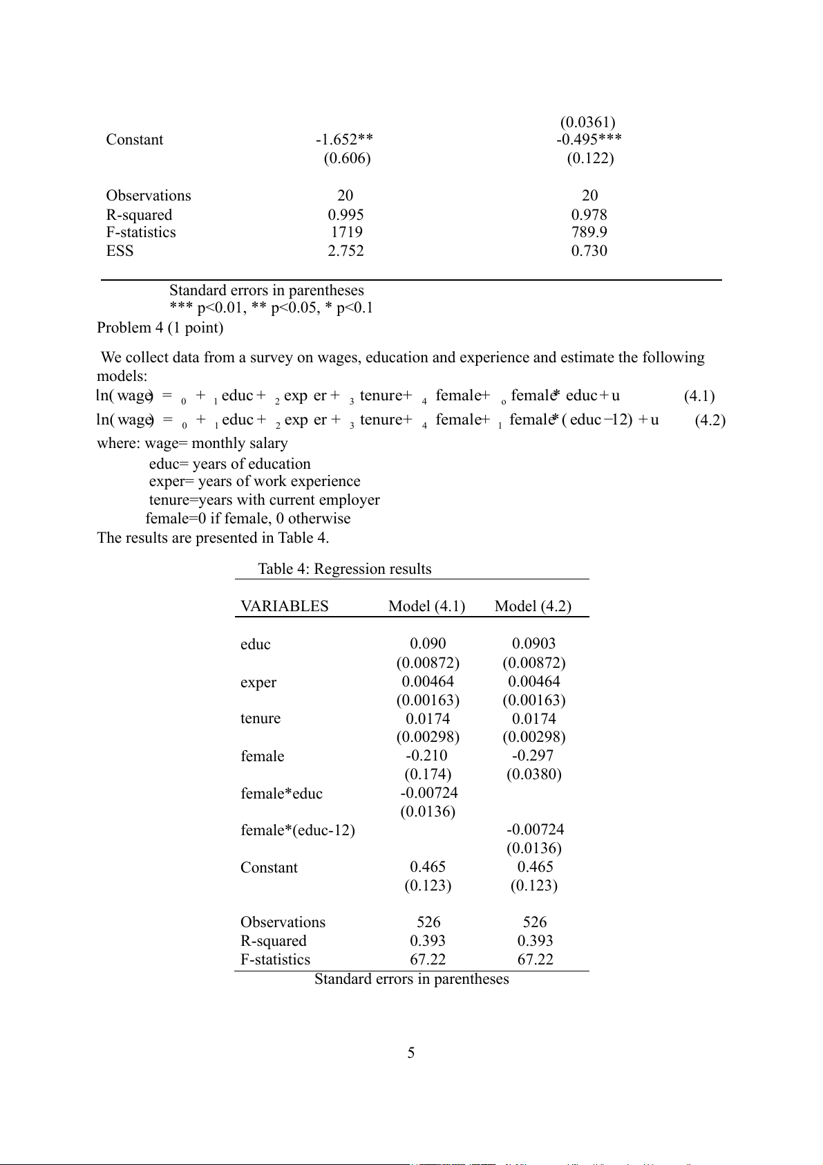 The results are presented in Table 4. Table 4: Regression results VARIABLES Model (4.1) Model (4.2) educ 0.090 0.0903 (0.00872) (0.00872) exper 0.00464 0.00464 (0.00163) (0.00163) tenure 0.0174 0.0174 (0.00298) (0.00298) female -0.210 -0.297 (0.174) (0.0380) female*educ -0.00724 (0.0136) female*(educ-12) -0.00724 (0.0136) Constant 0.465 0.465 (0.123) (0.123) Observations 526 526 R-squared 0.393 0.393 F-statistics 67.22 67.22