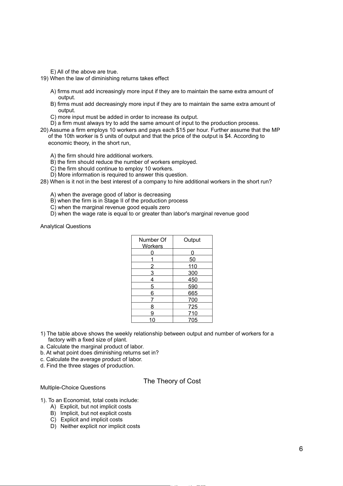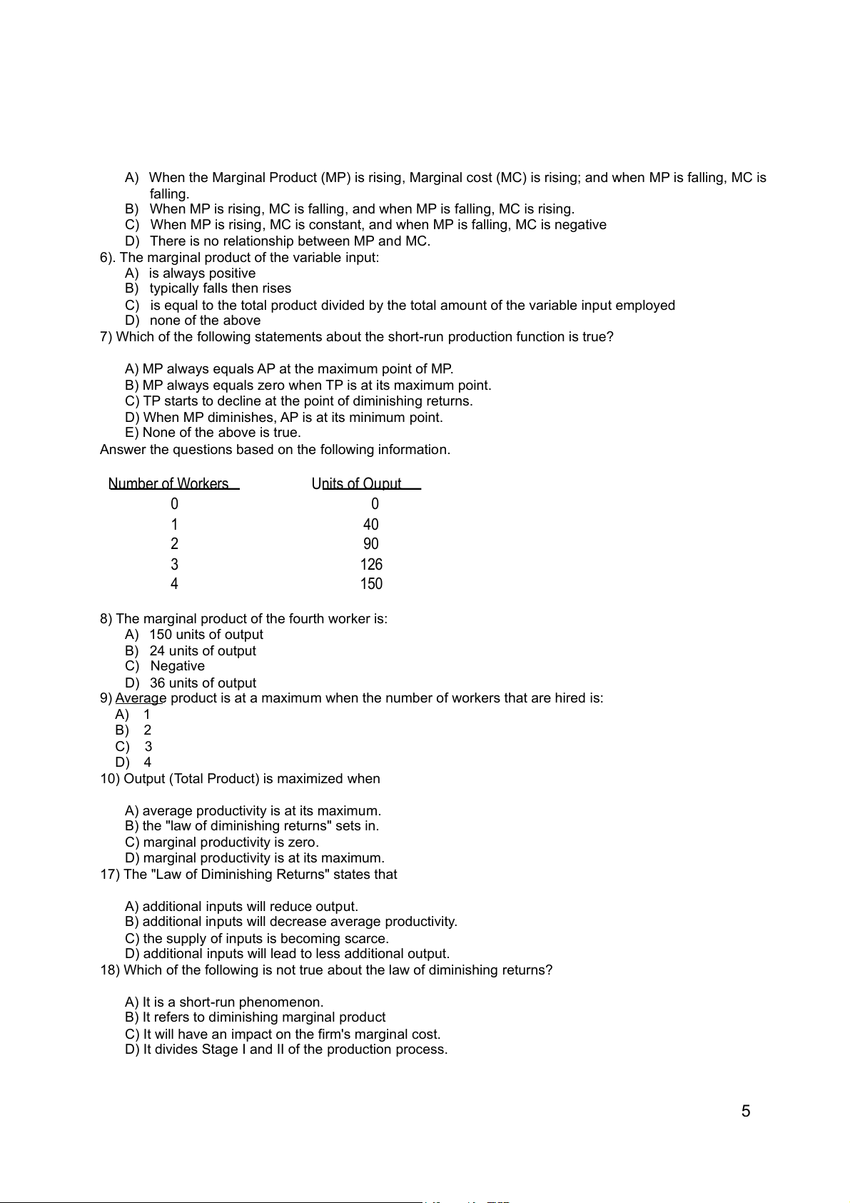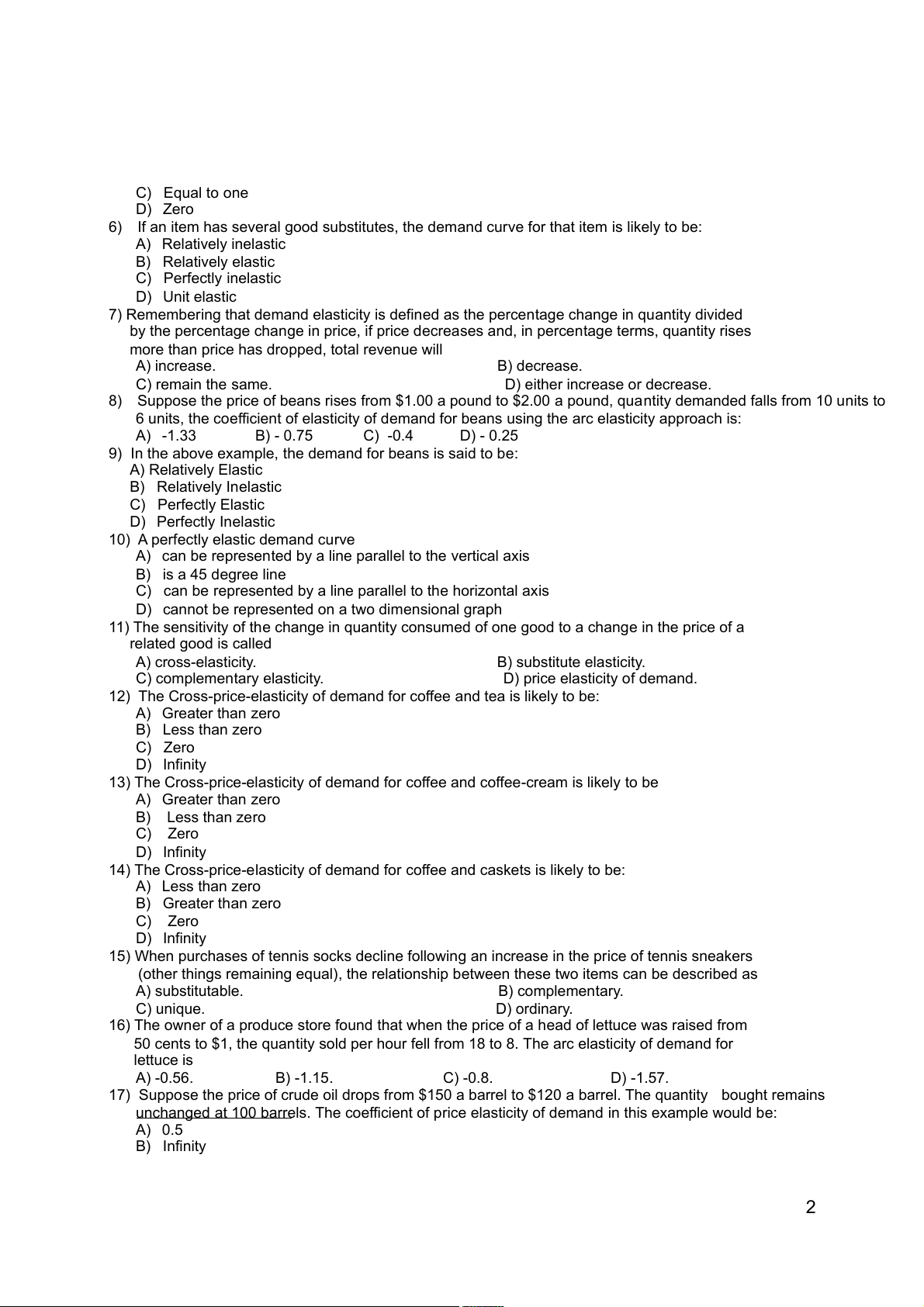 5) If the demand for a product is said to be relatively inelastic, the “absolute” value of the elasticity coefficient will be: A) Less than one B) Greater than one 1 C) Equal to one D) Zero