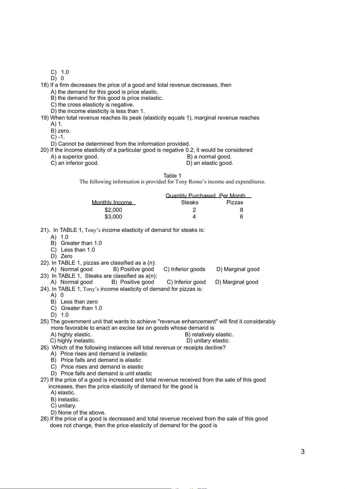 24). In TABLE 1, Tony’s income elasticity of demand for pizzas is: A) 0 B) Less than zero C) Greater than 1.0 D) 1.0