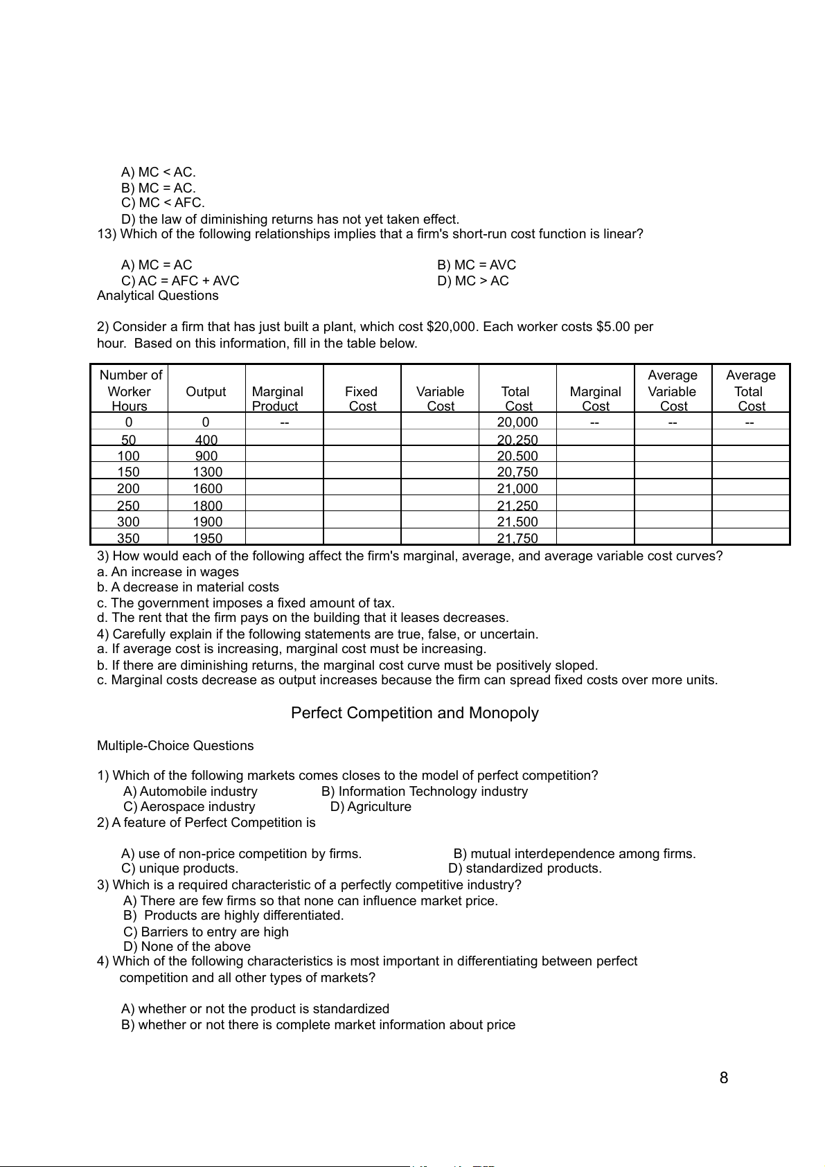 24). If an industry could be organized either perfectly competitively or as monopoly, a monopoly would A) Produce less output B) Produce where P > MC C) Charge higher prices. D) Al of the above