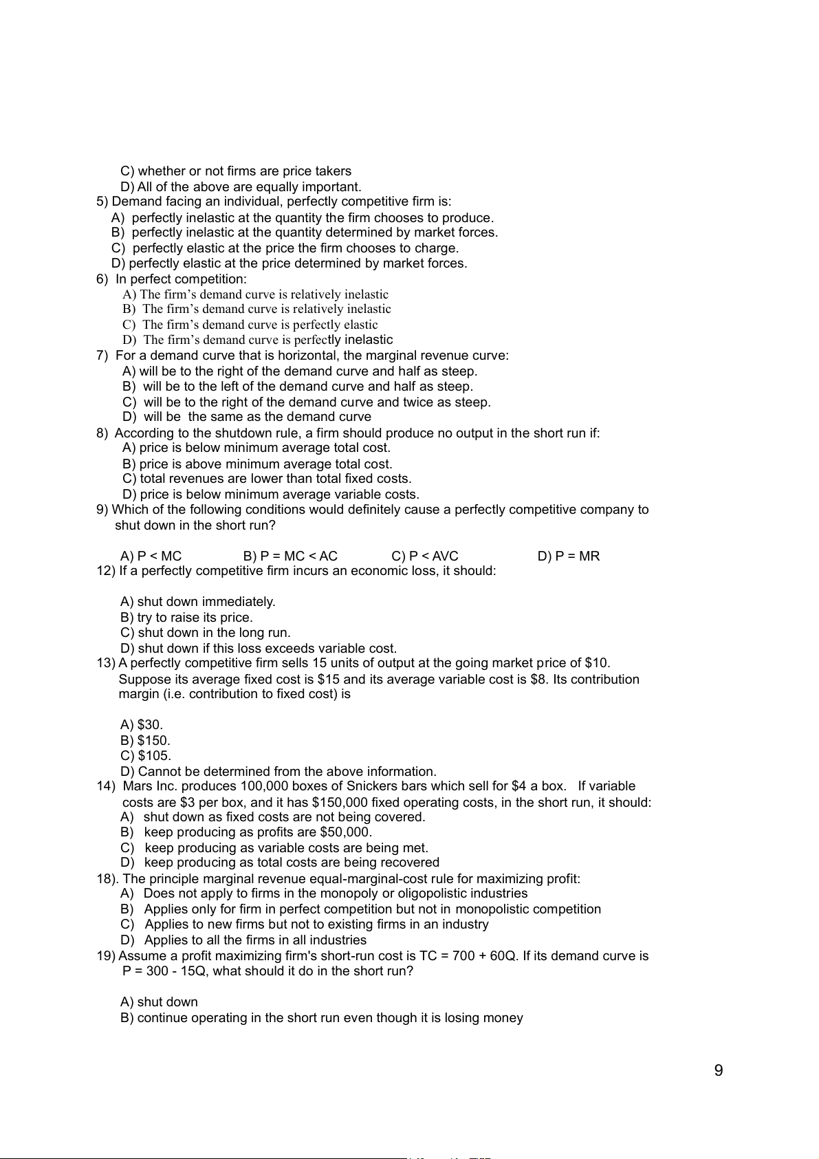 9) Which of the fol owing conditions would definitely cause a perfectly competitive company to shut down in the short run? A) P < MC B) P = MC < AC C) P < AVC D) P = MR