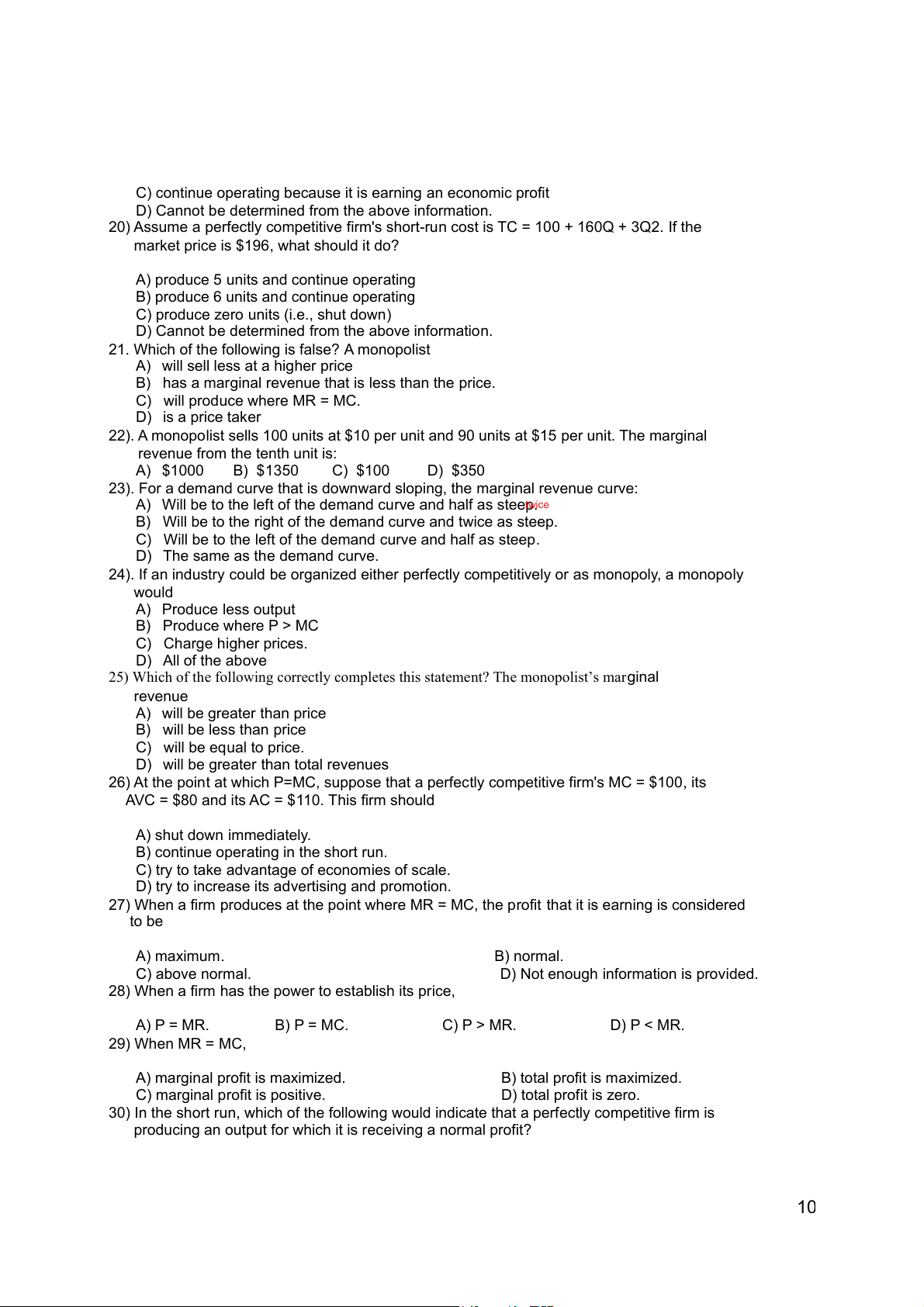 28) When a firm has the power to establish its price, A) P = MR. B) P = MC. C) P > MR. D) P < MR. 29) When MR = MC,
