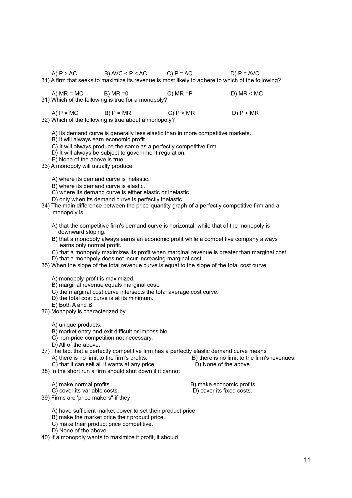 31) A firm that seeks to maximize its revenue is most likely to adhere to which of the fol owing? A) MR = MC B) MR =0 C) MR =P D) MR < MC