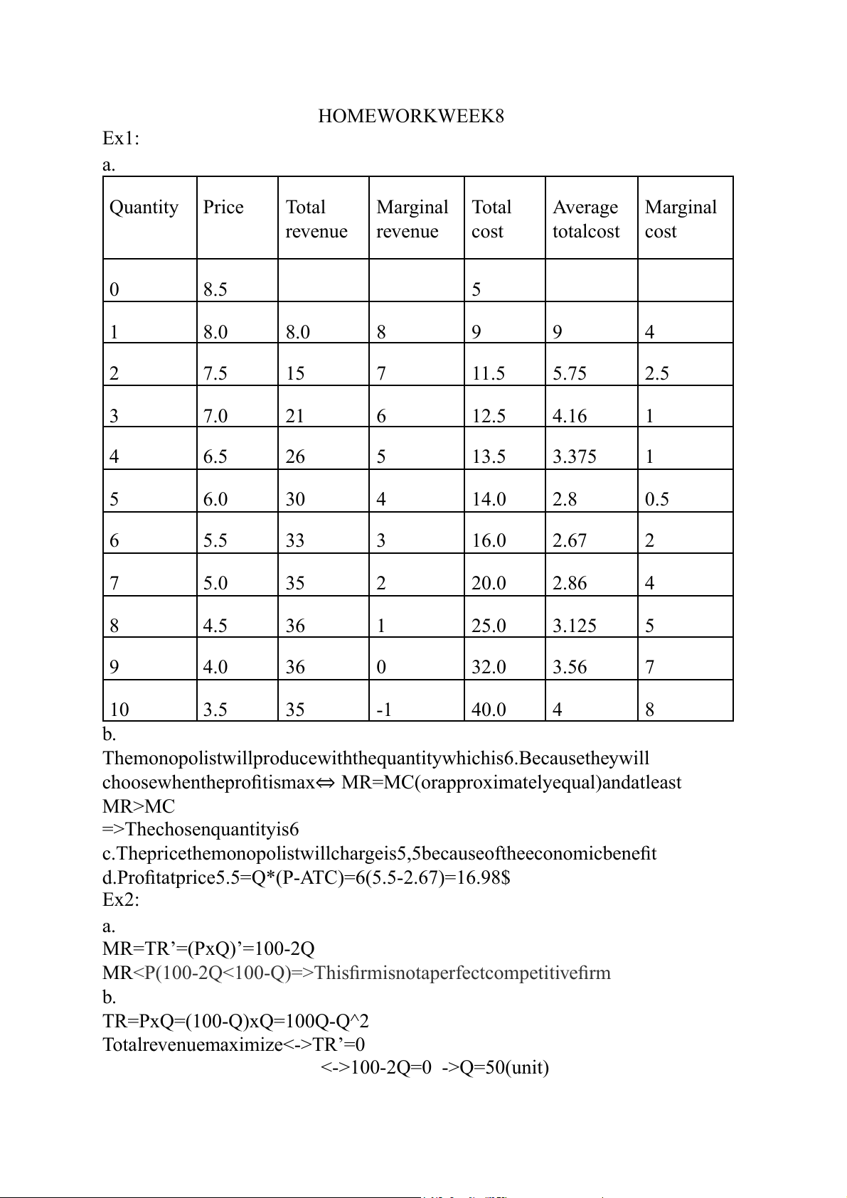 HOMEWORKWEEK8 Ex1: a. Quantity Price Total Marginal Total Average Marginal revenue revenue cost totalcost cost 0 8.5 5 1 8.0 8.0 8 9 9 4 2 7.5 15 7 11.5 5.75 2.5 3 7.0 21 6 12.5 4.16 1 4 6.5 26 5 13.5 3.375 1 5 6.0 30 4 14.0 2.8 0.5 6 5.5 33 3 16.0 2.67 2 7 5.0 35 2 20.0 2.86 4 8 4.5 36 1 25.0 3.125 5 9 4.0 36 0 32.0 3.56 7 10 3.5 35 -1 40.0 4 8 b.