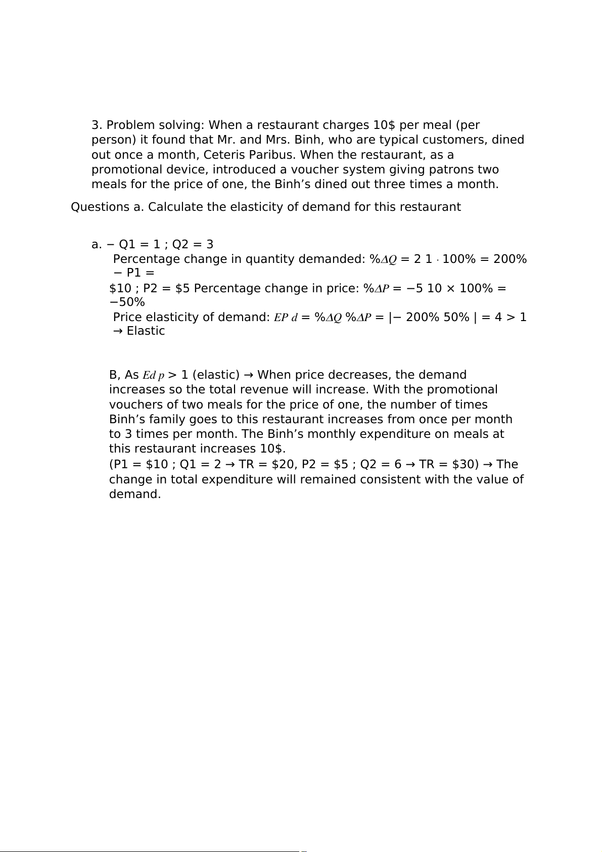 Questions a. Calculate the elasticity of demand for this restaurant a. − Q1 = 1 ; Q2 = 3