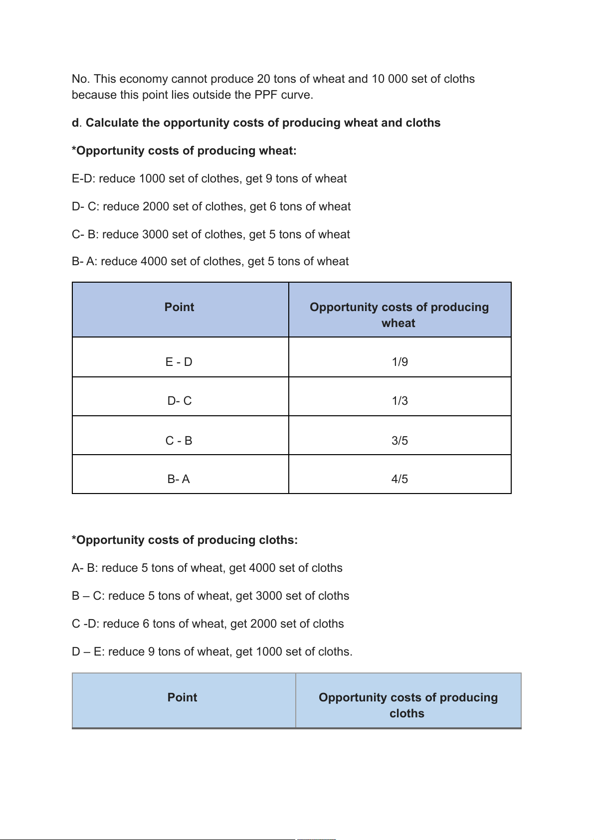 D – E: reduce 9 tons of wheat, get 1000 set of cloths. Point Opportunity costs of producing cloths A - B 5/4 B - C 5/3 C - D 3 D - E 9