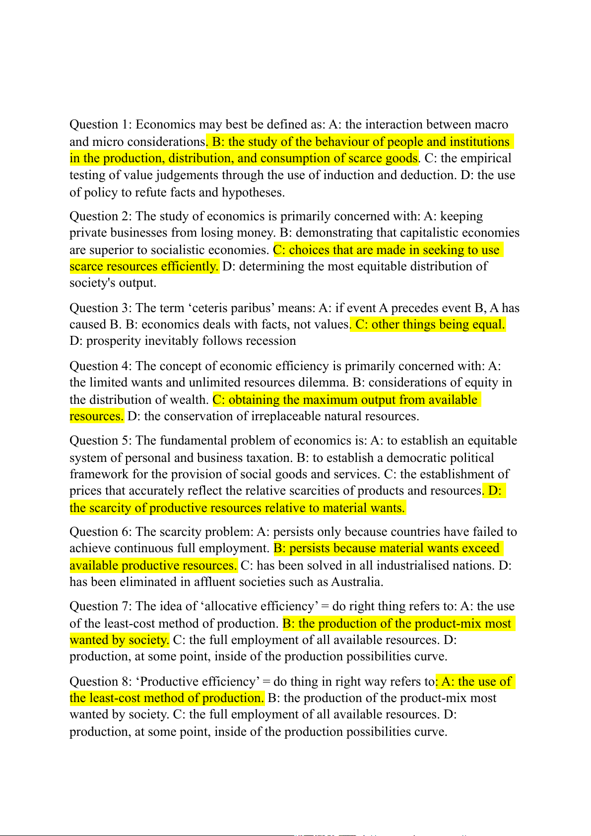 Question 8: ‘Productive efficiency’ = do thing in right way refers to: A: the use of