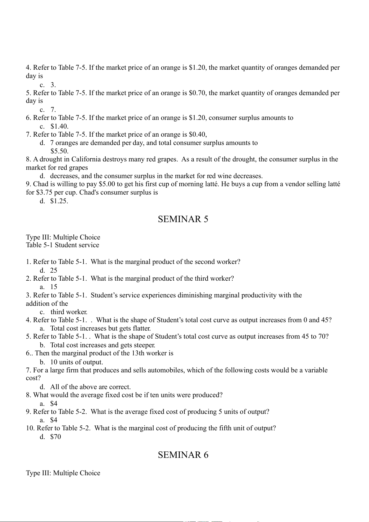 10. Refer to Table 5-2. What is the marginal cost of producing the fifth unit of output? d. $70 SEMINAR 6 Type III: Multiple Choice