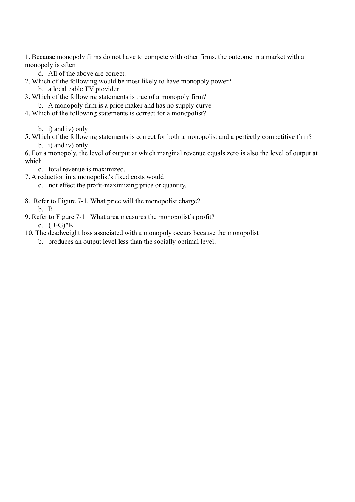 9. Refer to Figure 7-1. What area measures the monopolist’s profit? c. (B-G)*K