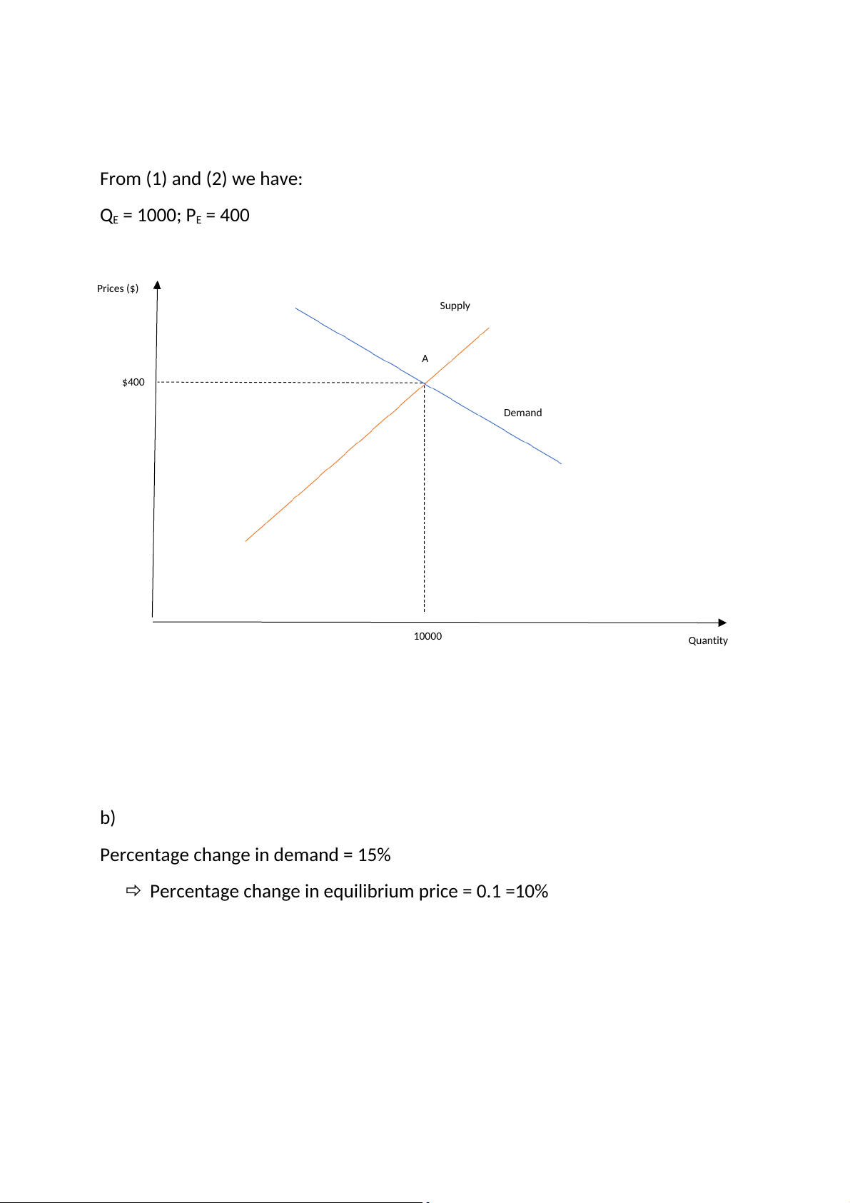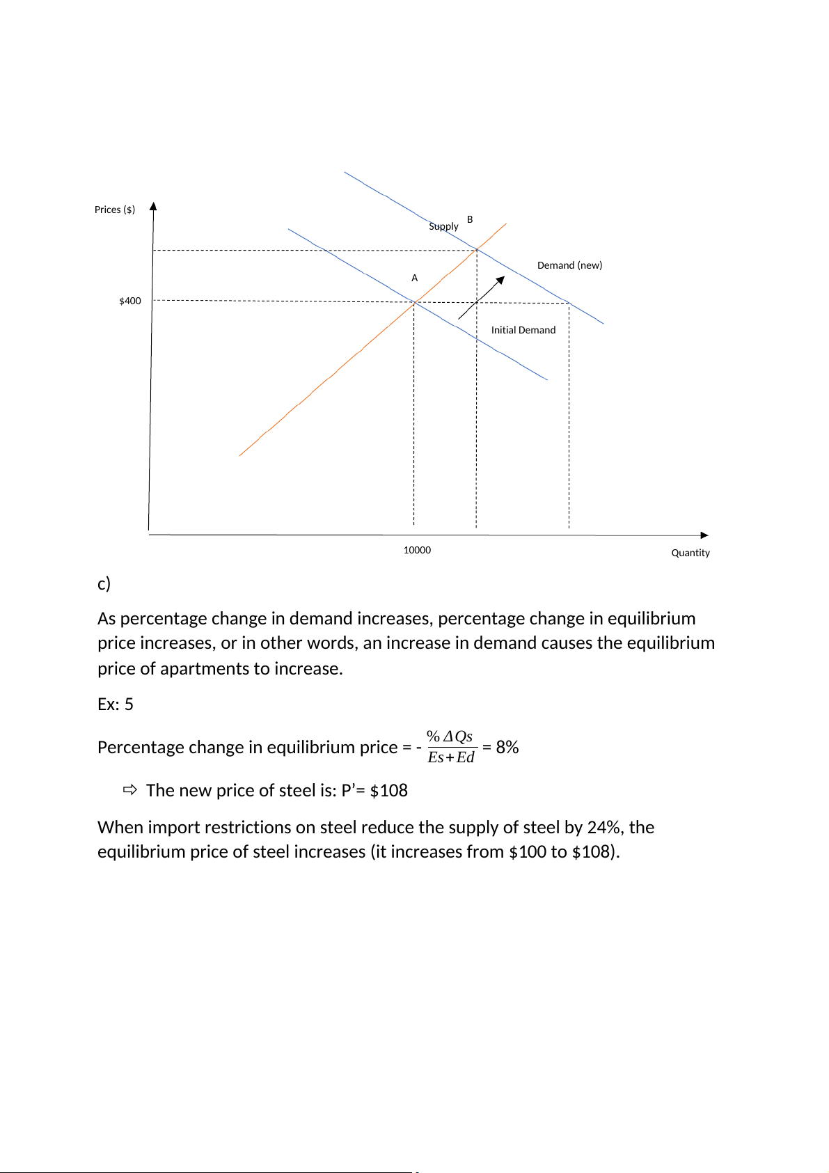 Percentage change in equilibrium price = 0.1 =10% Prices ($) B Supply Demand (new) A $400 Initial Demand 10000 Quantity c)