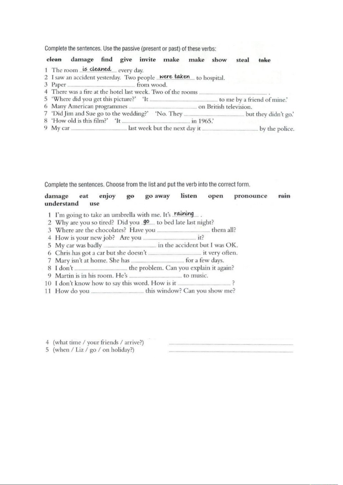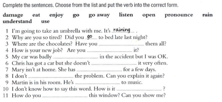 3. eaten; 4. enjoying ; 5. Damaged; 6. Use; 7. Gone away; 8. Understand; 9. Listening; 10. Pronounced; 11. Open.